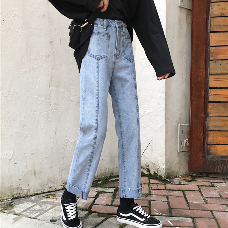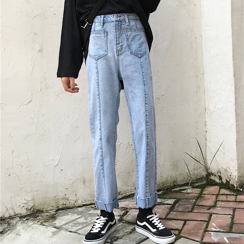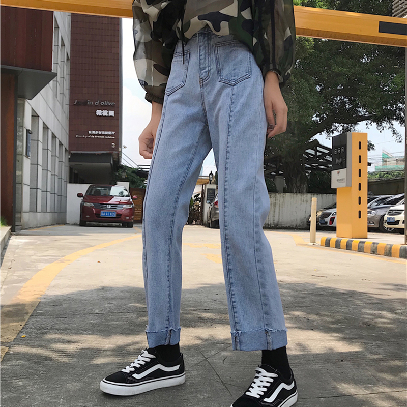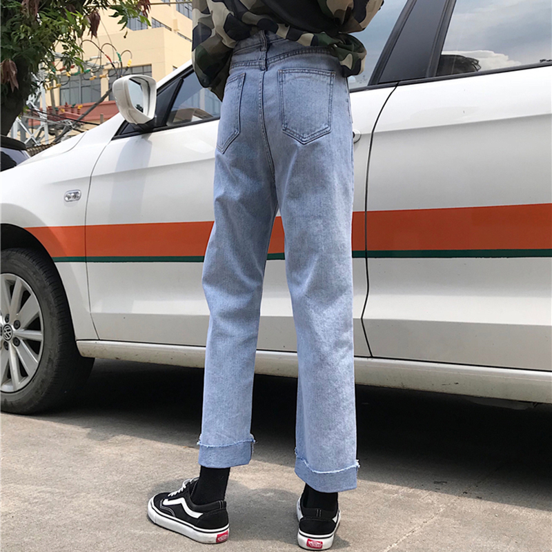 高腰卷邊九分牛仔褲女秋冬裝2018新款韓版學生寬松顯瘦直筒褲子潮