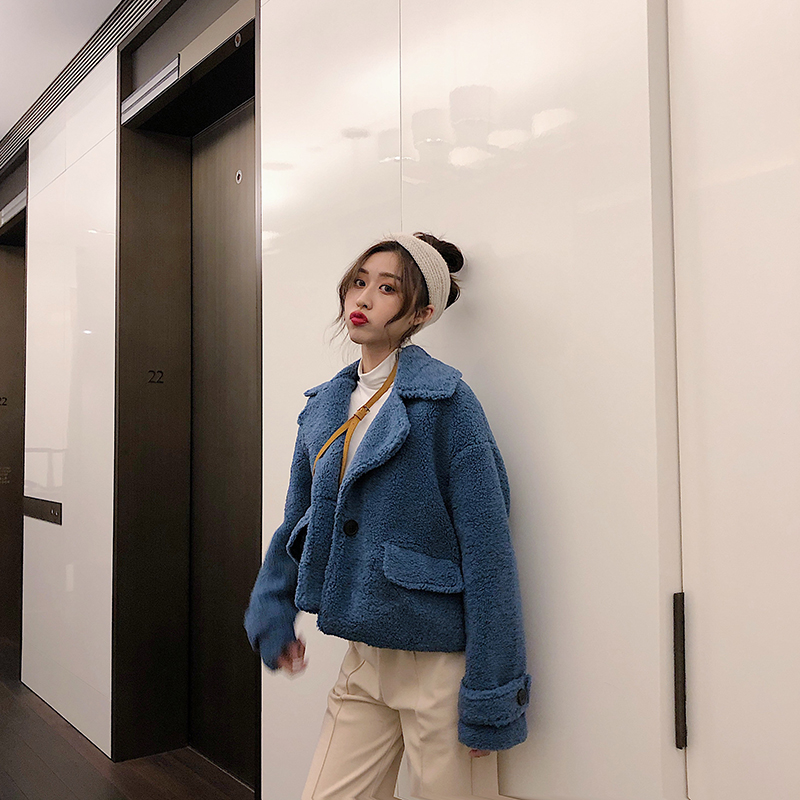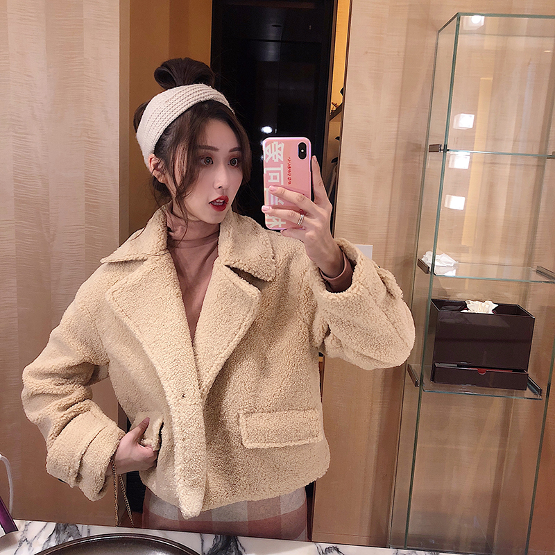 復古溫柔百搭慵懶西服領短款加厚保暖羊羔毛開衫外套女2018新款潮