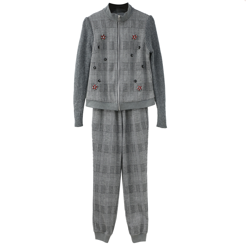 / 名媛網紅氣質2018秋季新款休閑風毛衣拼接格子套裝小腳褲兩件套潮