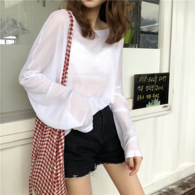 / 夏季韓版港味復古寬松透視薄款罩衫百搭長袖T恤女新款防曬衫上衣