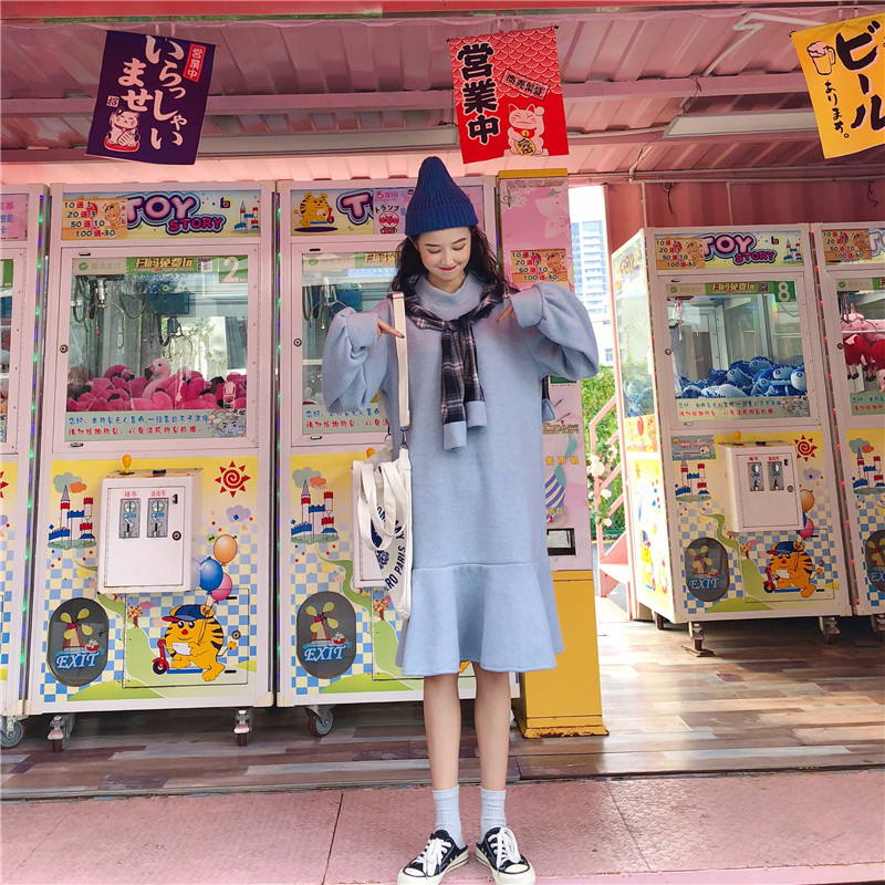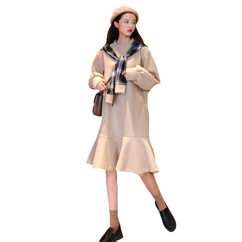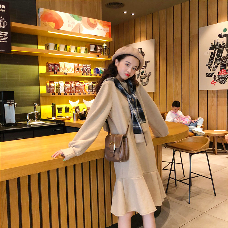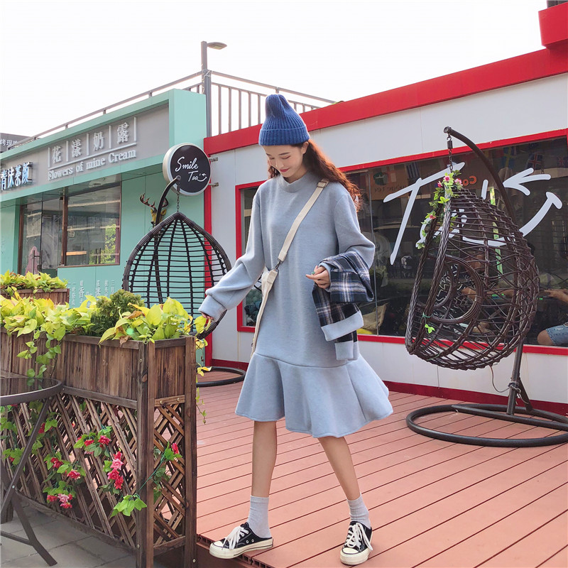 / 秋季韓版chic可拆卸格子披肩中長款寬松長袖魚尾衛衣連衣裙長裙女