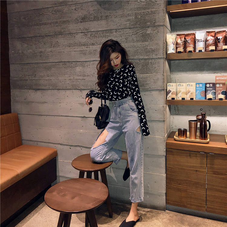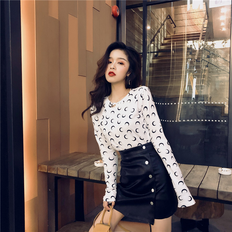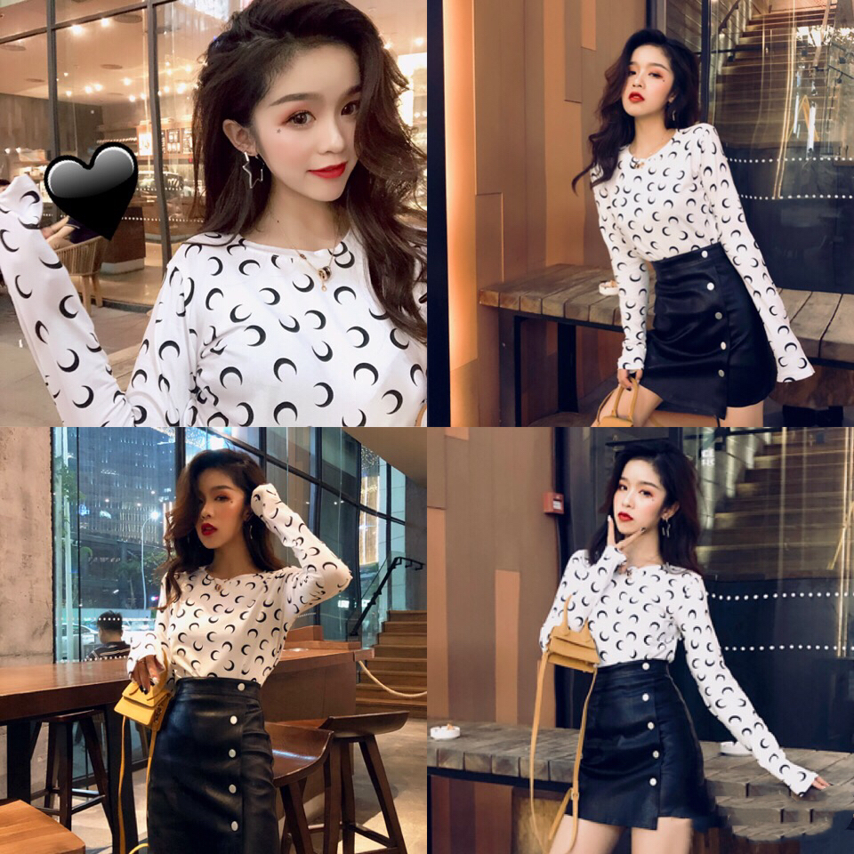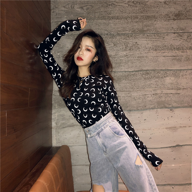 / 港風2018新款秋季百搭上衣chic顯瘦薄款印花月亮修身打底長袖T恤