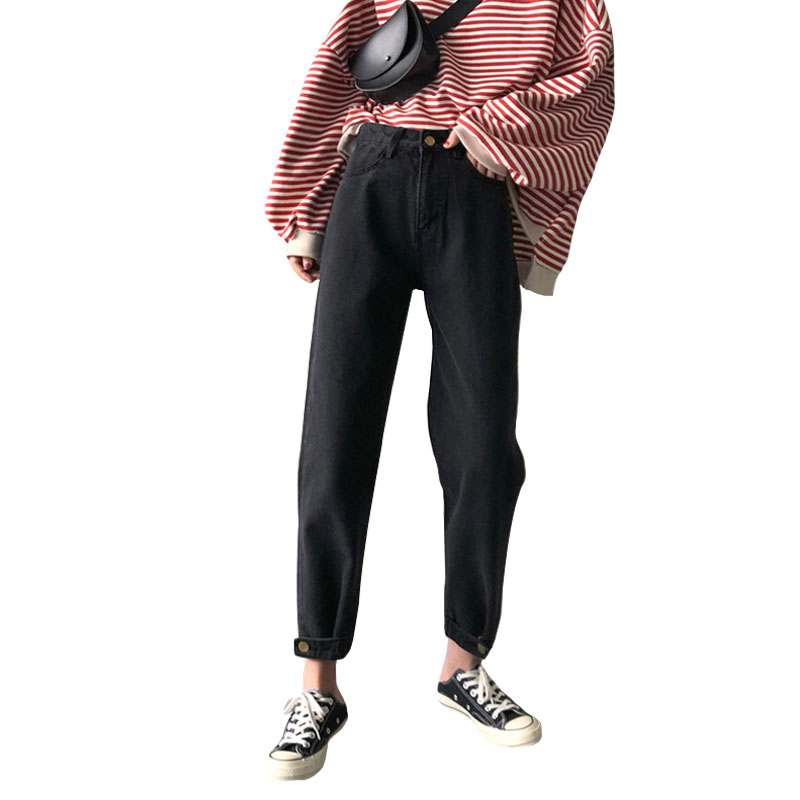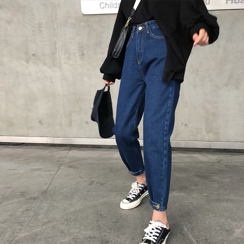 / 秋季女裝韓版褲腳紐扣收口九分褲牛仔褲寬松高腰顯瘦束腳褲直筒褲