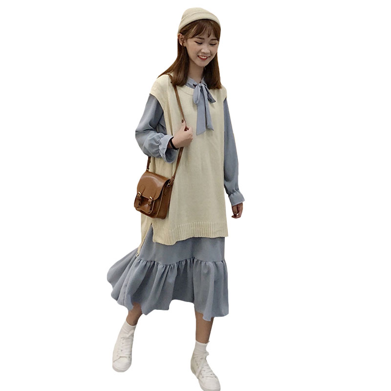 / 韓版時尚休閑套裝秋裝女裝chic系帶荷葉邊連衣裙+針織馬甲兩件套
