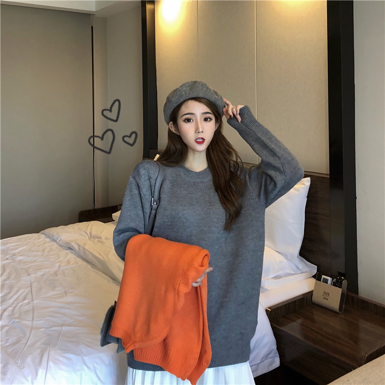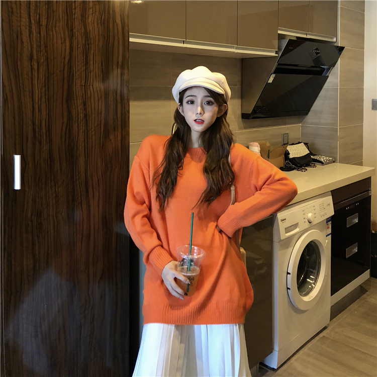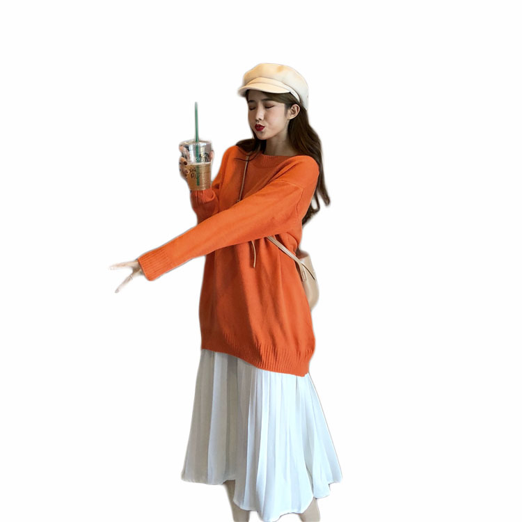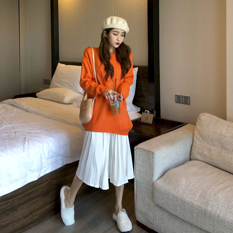 韓版慵懶風中長款粗毛線橘色毛衣+復古奶油白色百褶半身長裙套裝