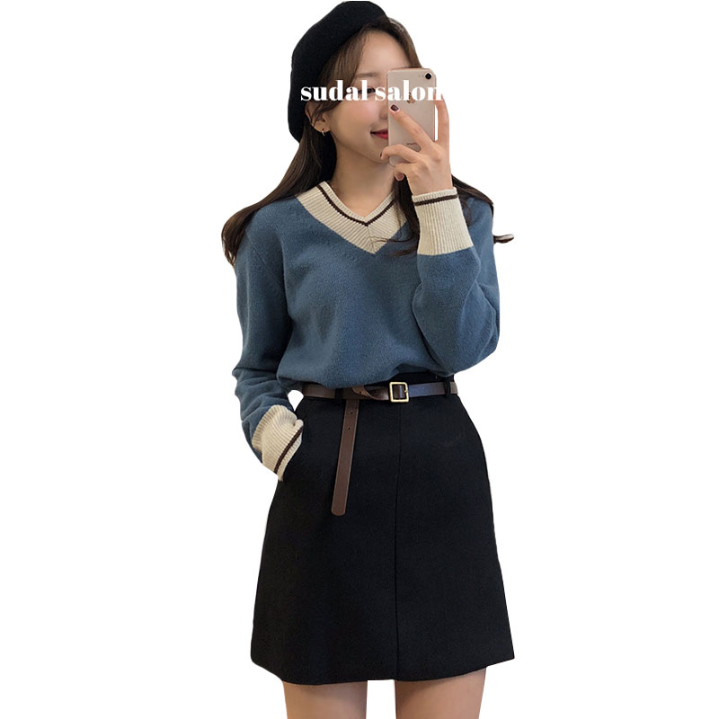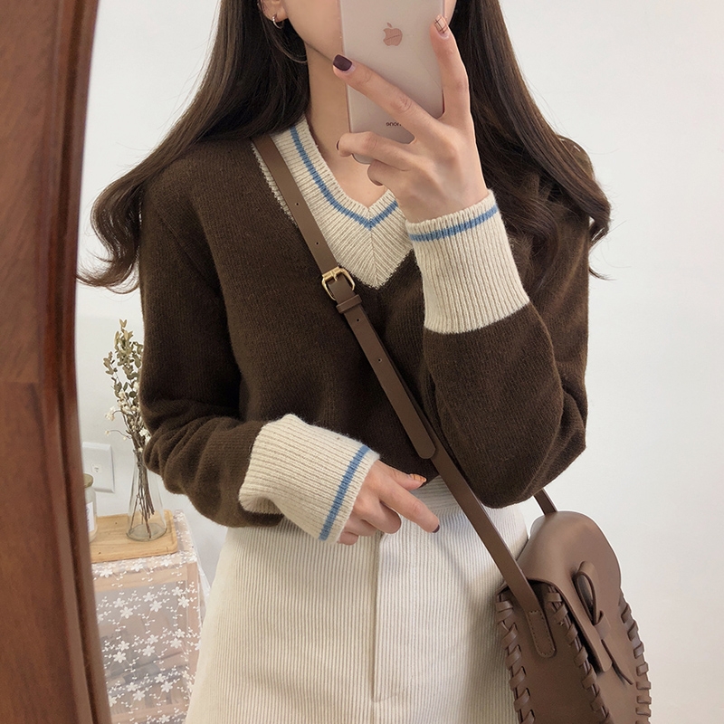/ 秋冬韓版chic復古寬松條紋撞色V領網紅套頭針織衫毛衣上衣外套女