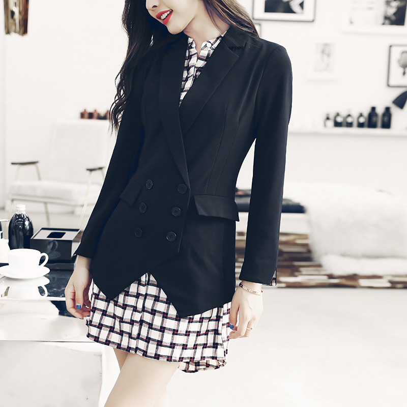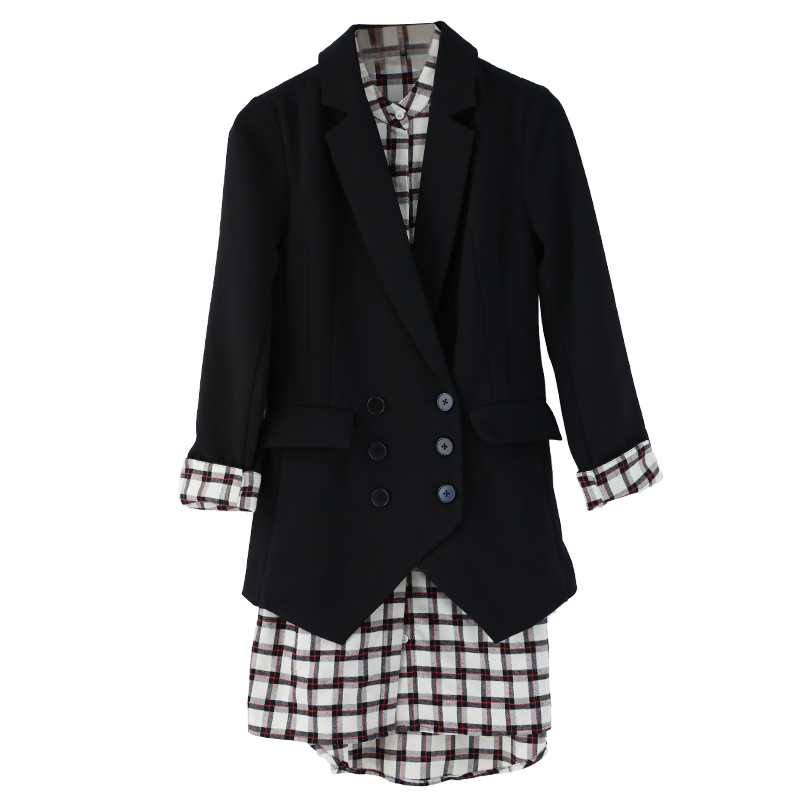 / 名媛氣質2018秋季新款格子襯衫拼接假兩件中長款西裝外套連衣裙潮