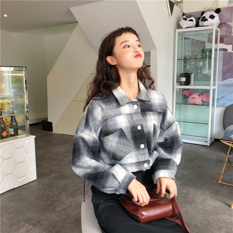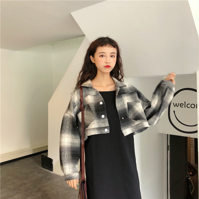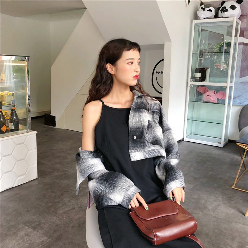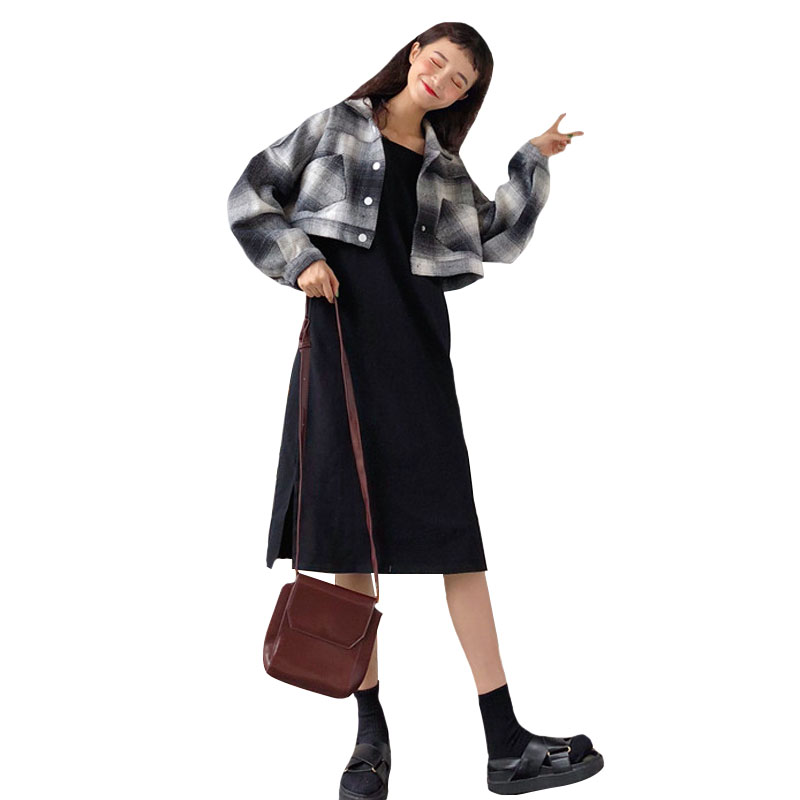 / 韓版時尚休閑套裝秋季女裝短款格子呢子外套+吊帶裙連衣裙兩件套