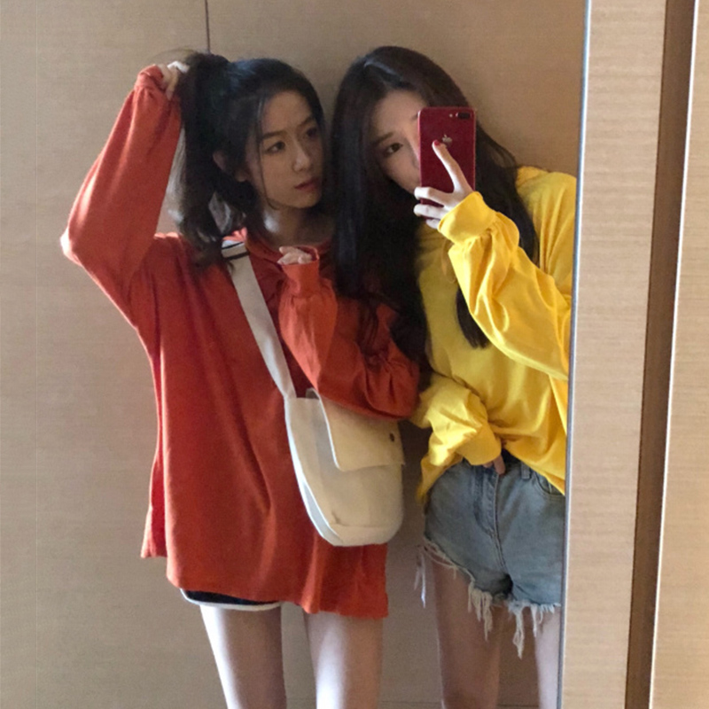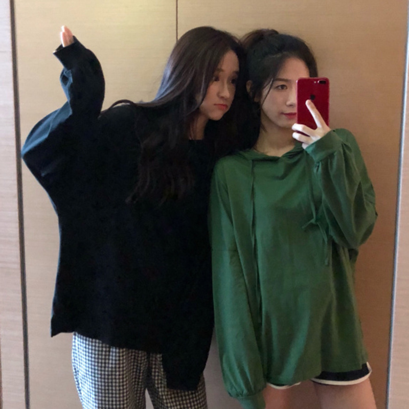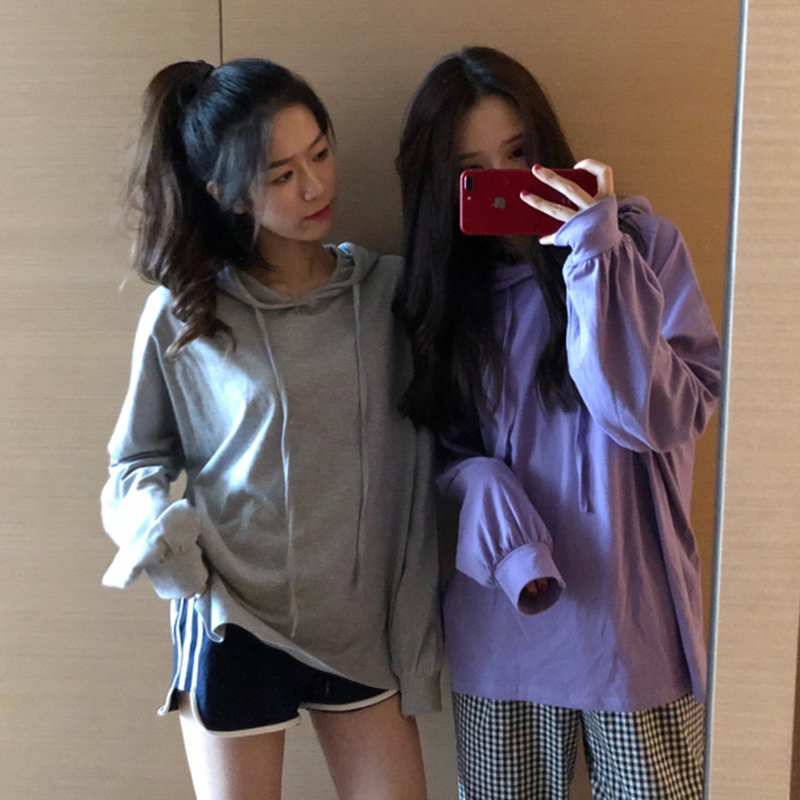 秋裝女裝韓版寬松基礎款連帽休閑套頭衛衣寬松中長款長袖學生外套