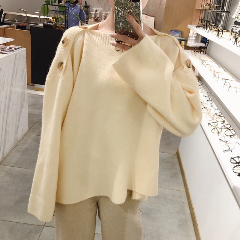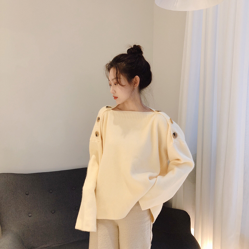 / 新款一字領套頭慵懶風復古chic長袖秋冬百搭毛衣女寬松針織衫上衣