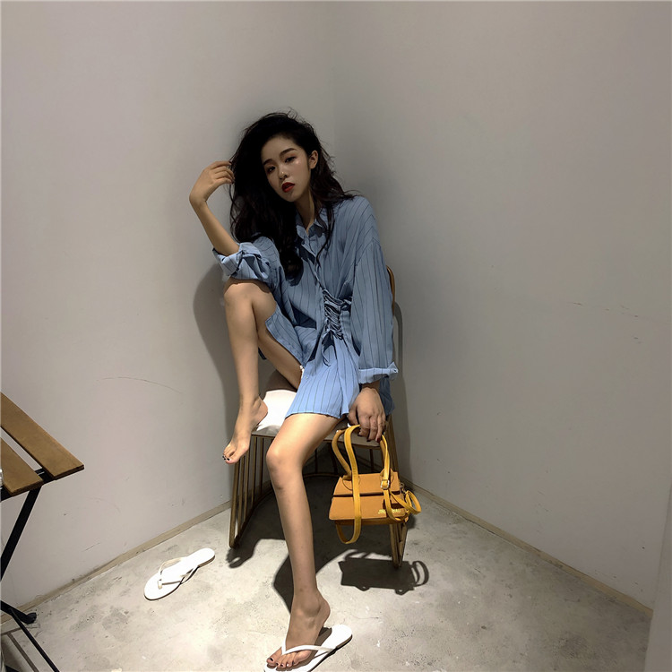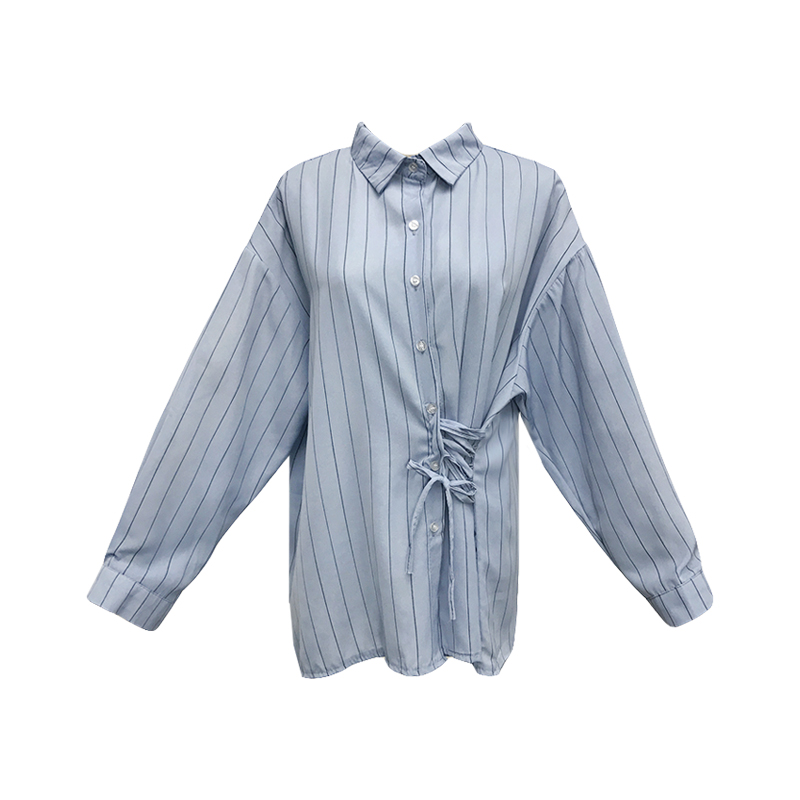 / 復古溫柔條紋襯衣女2018新款不對稱多種穿法霧藍色氣質慵懶襯衫潮