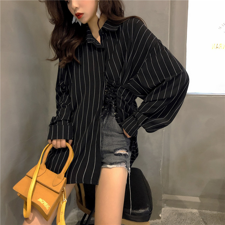 韓版時尚秋裝女2018新款港味條紋披肩拼接長袖寬松純色百搭襯衣潮