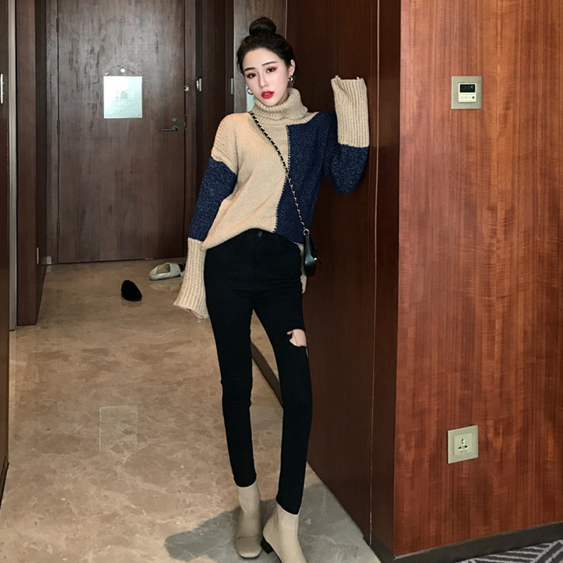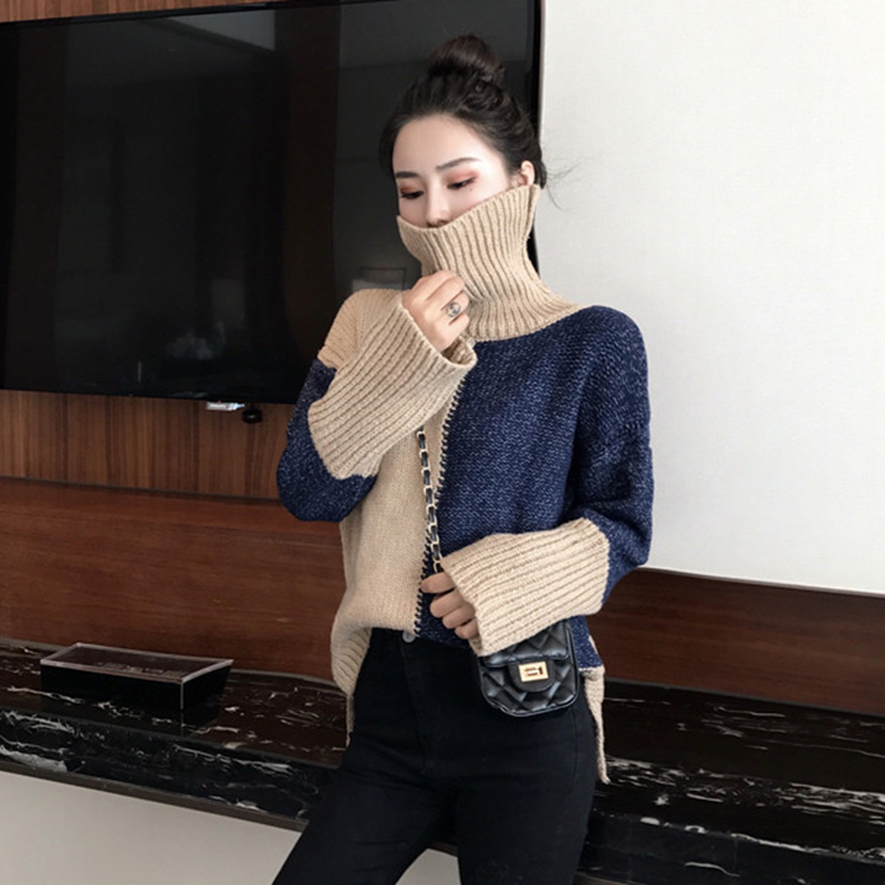/ 韓版高領拼色毛衣外套女冬裝2018新款chic氣質寬松長袖套頭針織衫