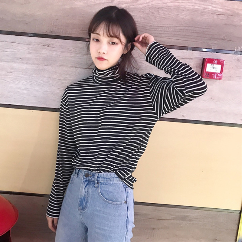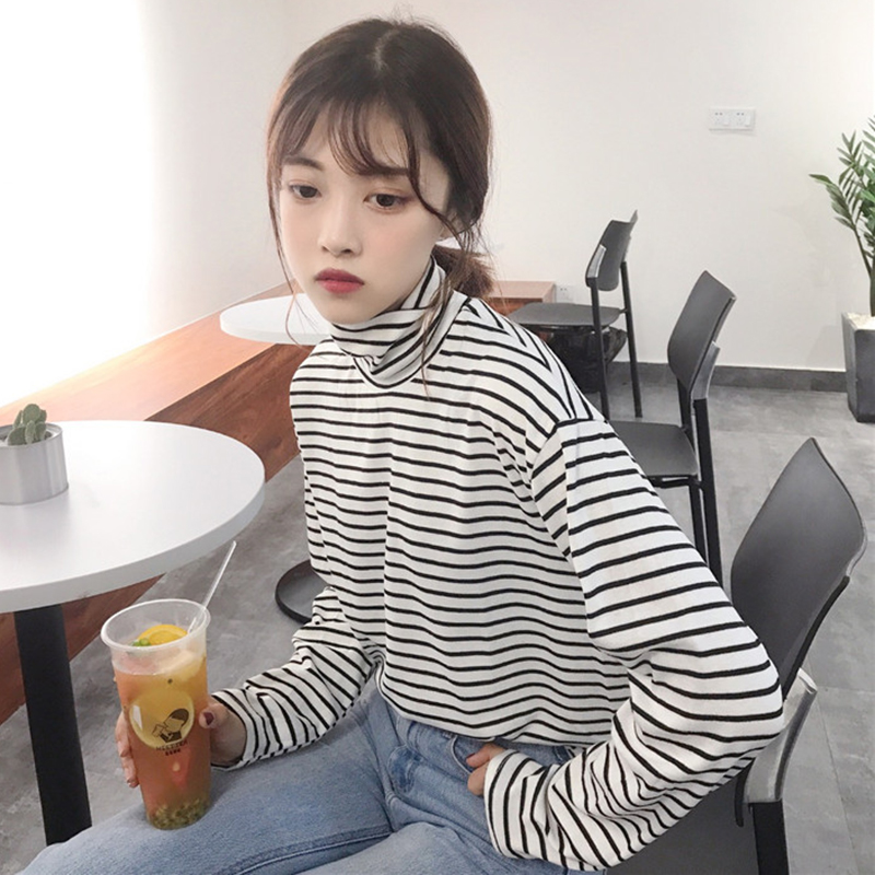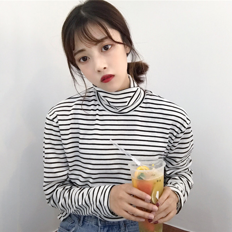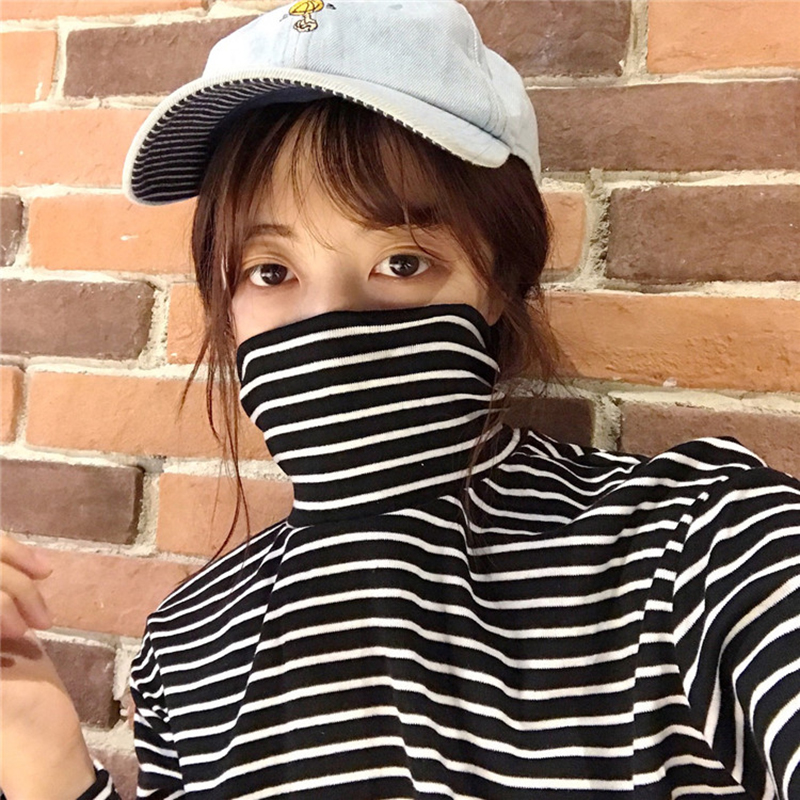 原宿風學生黑色條紋打底衫女秋裝2018新款寬松高領長袖T恤上衣潮