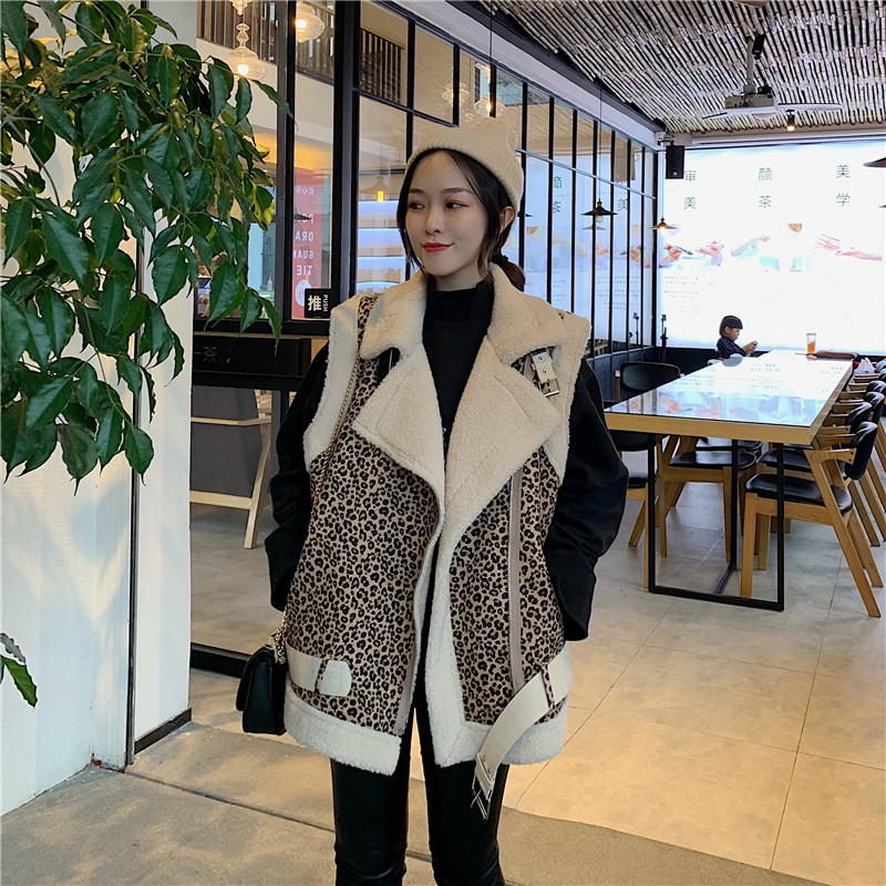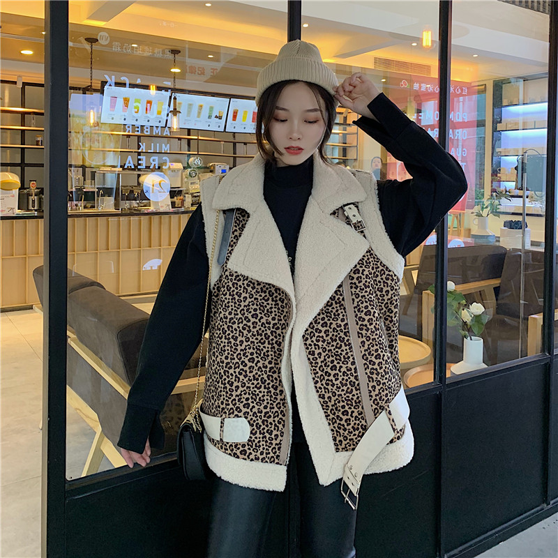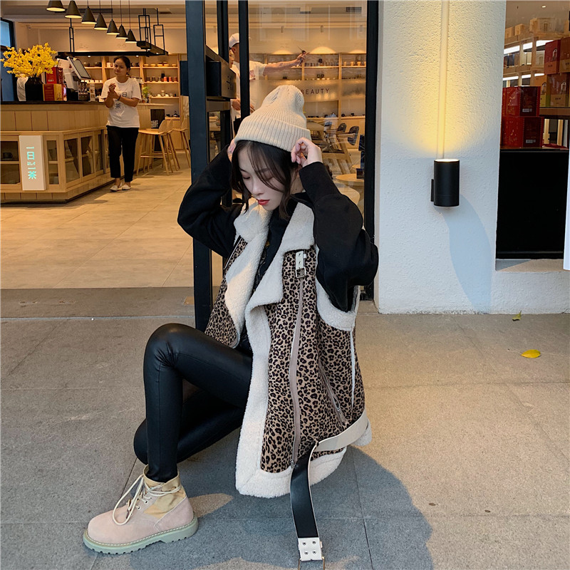 / 港味女神套裝秋羊羔毛機車服加厚短款馬甲外套+加絨pu高腰緊身褲
