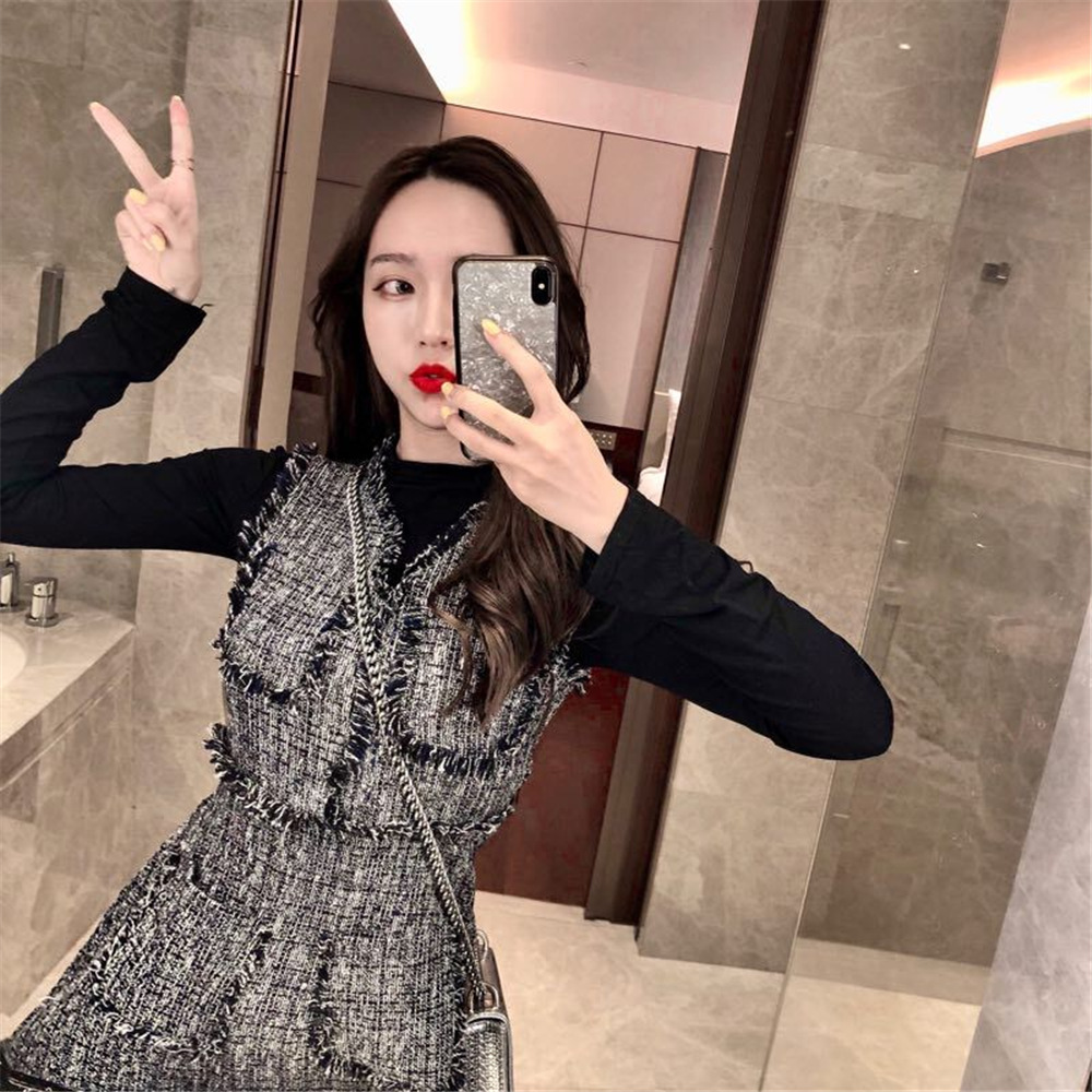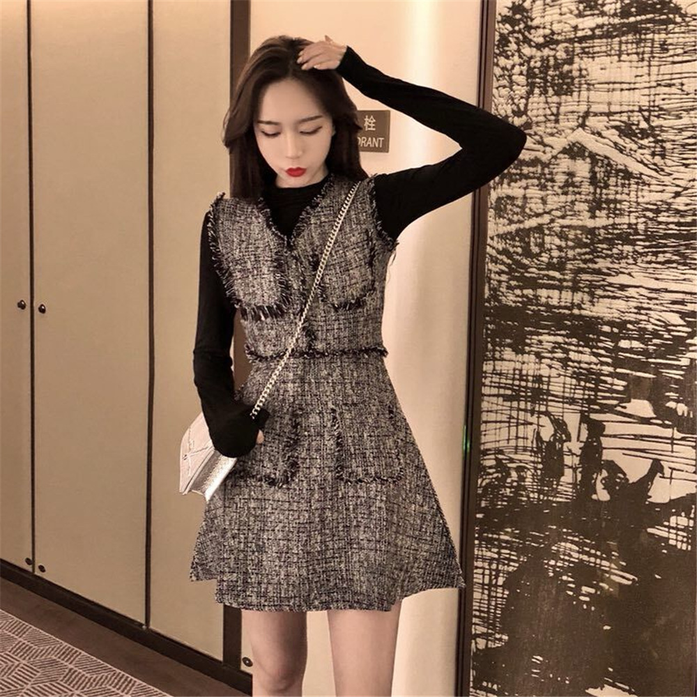 時尚韓版秋裝女2018新款名媛粗花格子修身長袖兩件套連衣裙套裝潮