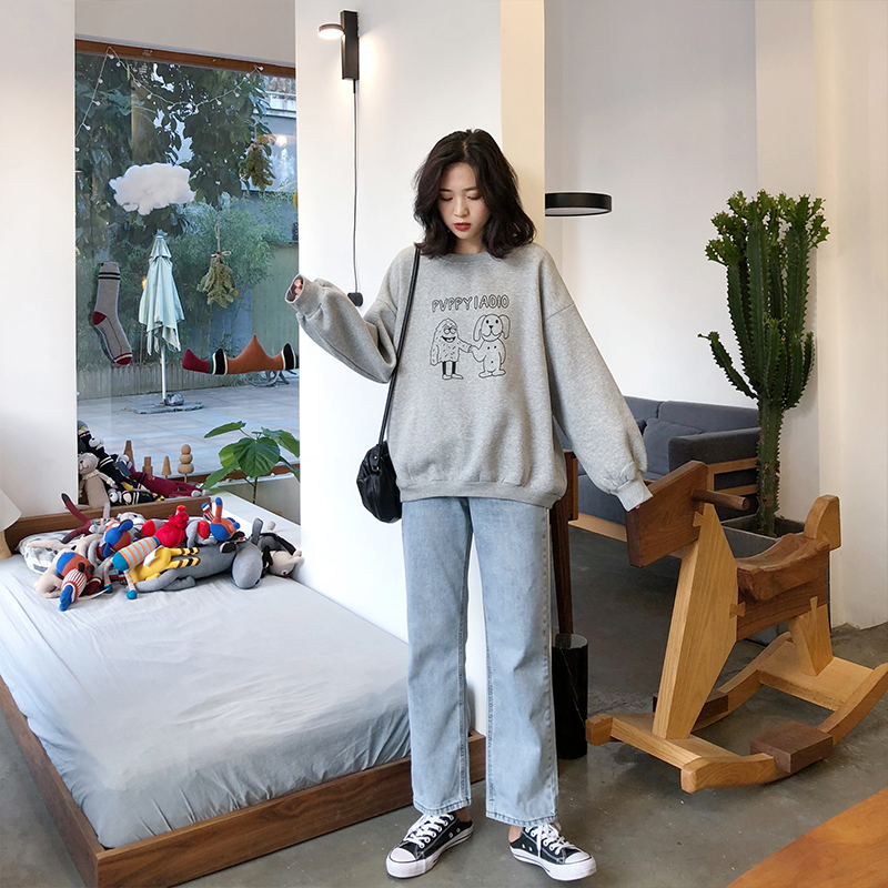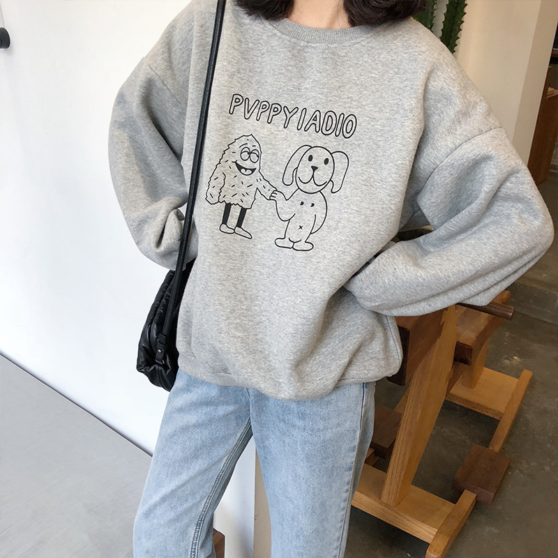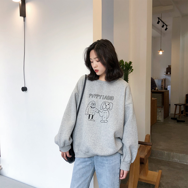 A7seven 春秋款衛衣女印花灰色韓版純棉寬松圓領無帽學生套頭外套