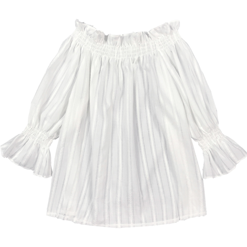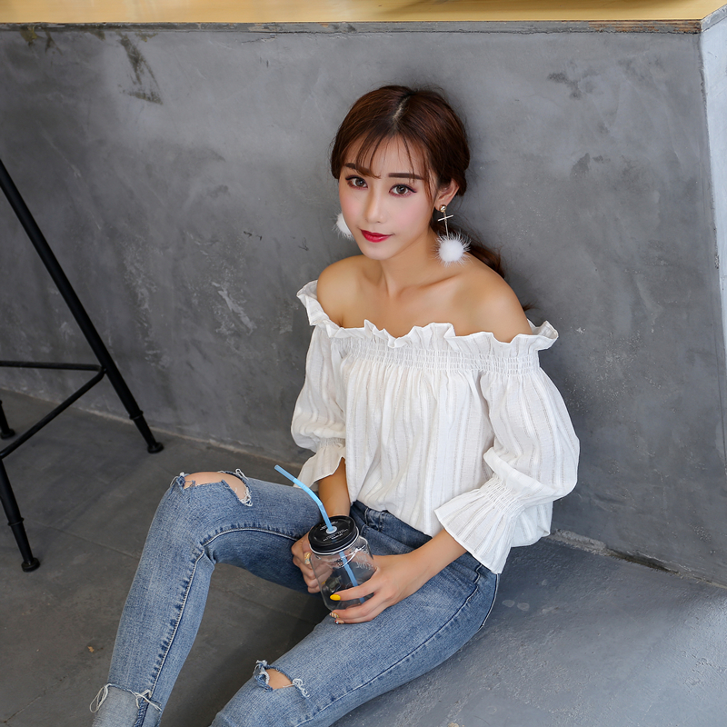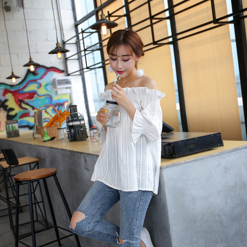 / 早春新款女裝露肩一字領寬松顯瘦燈籠袖長袖學生百搭襯衫上衣女