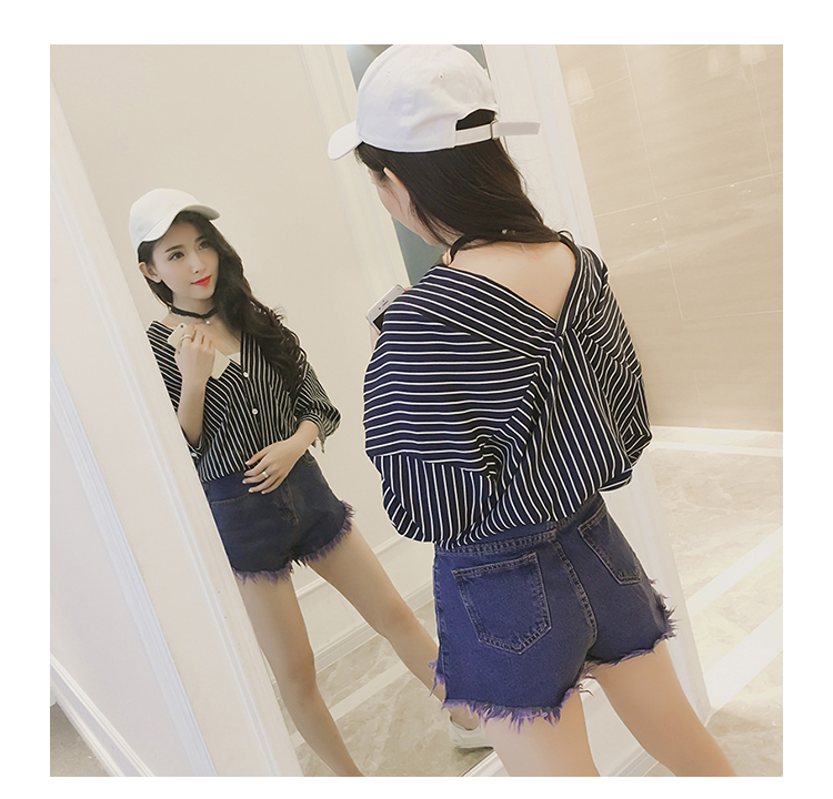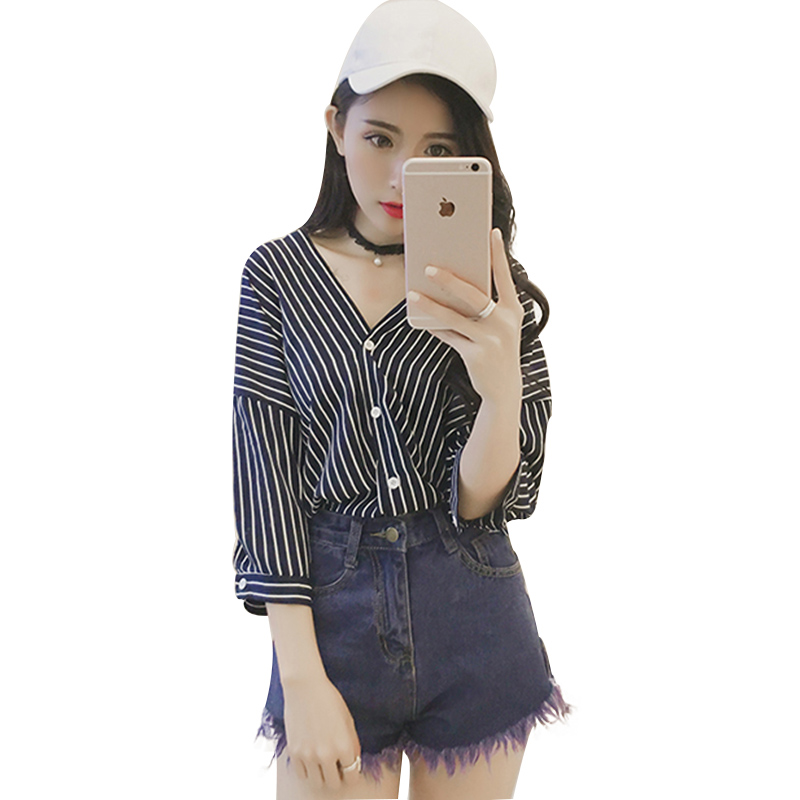 / 秋裝2018新款夏韓范時尚寬松顯瘦學生豎條紋V領襯衫女蝙蝠袖上衣