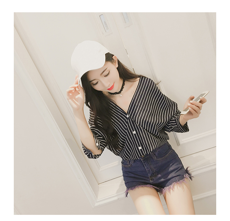 秋裝2018新款夏韓范時尚寬松顯瘦學生豎條紋V領襯衫女蝙蝠袖上衣
