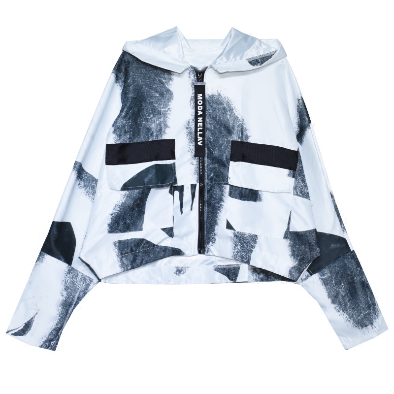顯瘦百搭港味抽象印花連帽拉鏈上衣氣質款寬松蝙蝠袖短款外套潮女