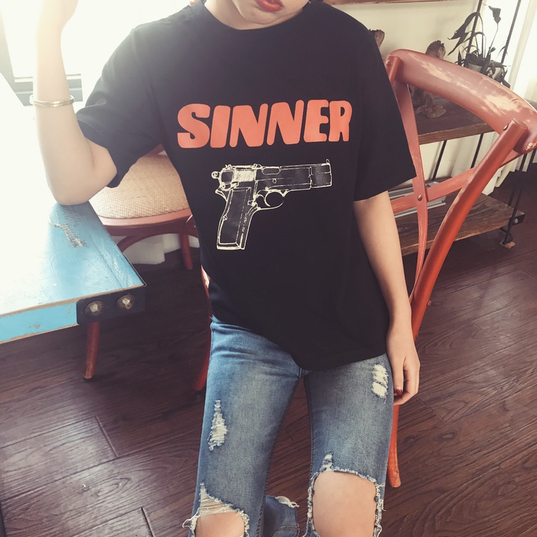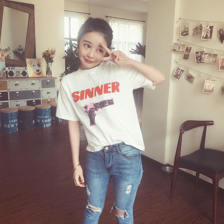 2017春夏新品學院風寬松百搭字母手槍印花圓領套頭短袖T恤