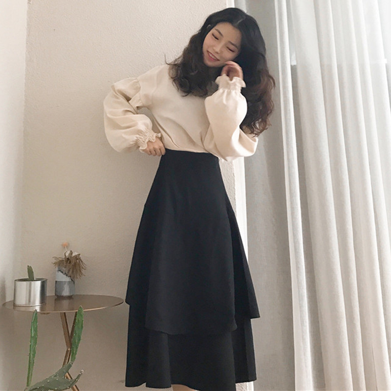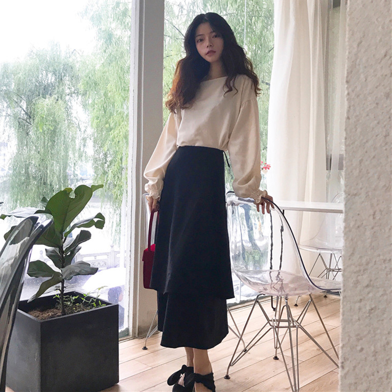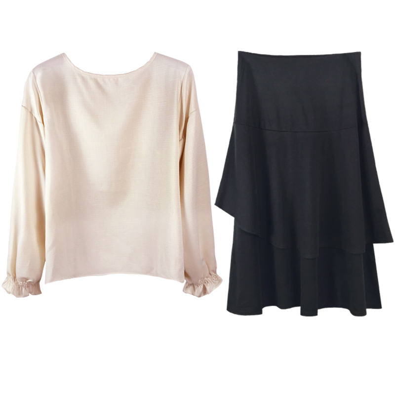 2018早秋新款時尚兩件套女寬松純色長袖襯衣+不規則高腰a字半身裙