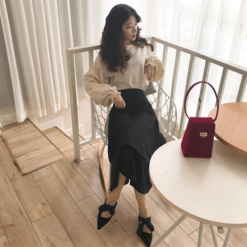 / 2018早秋新款時尚兩件套女寬松純色長袖襯衣+不規則高腰a字半身裙