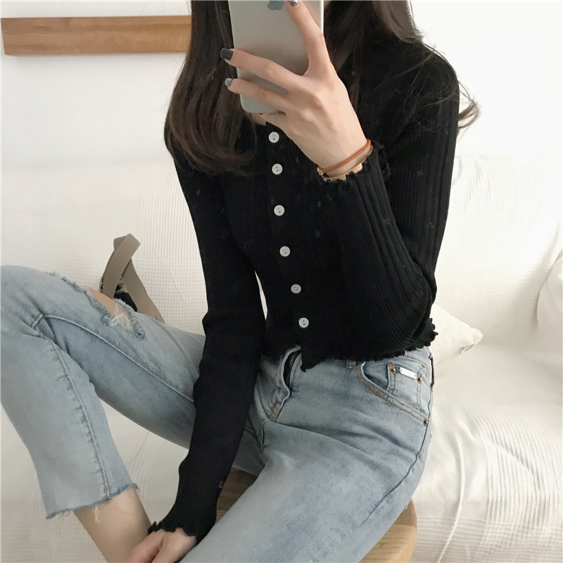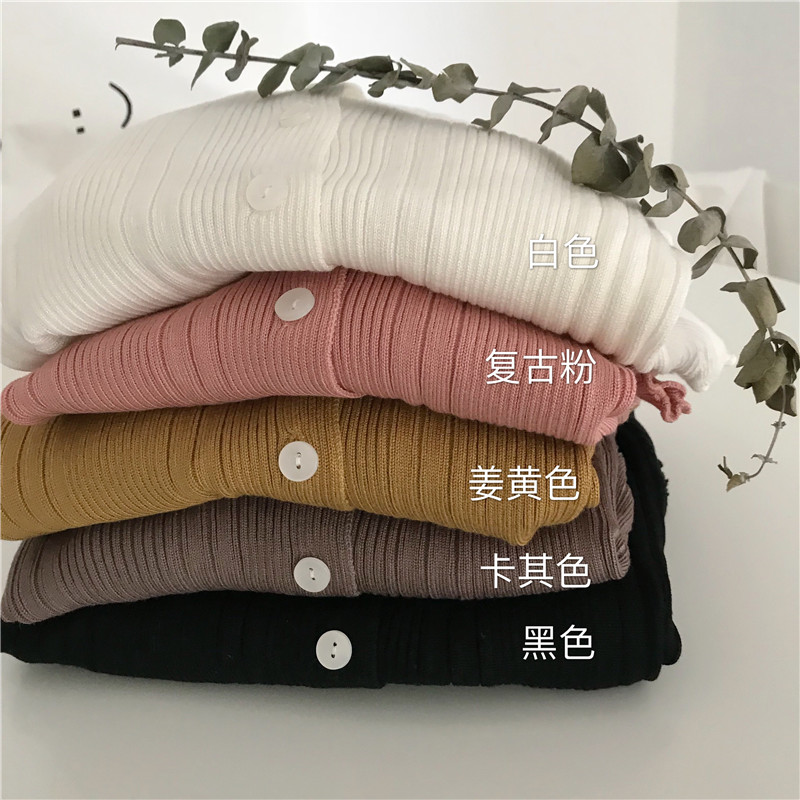 韓版chic早秋慵懶溫柔毛衣坑條V領一排扣喇叭袖純色百搭針織開衫