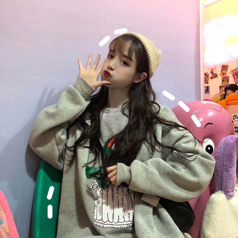 / 2018新款秋冬女裝韓版中長款寬松慵懶風卡通加絨加厚套頭衛衣外套