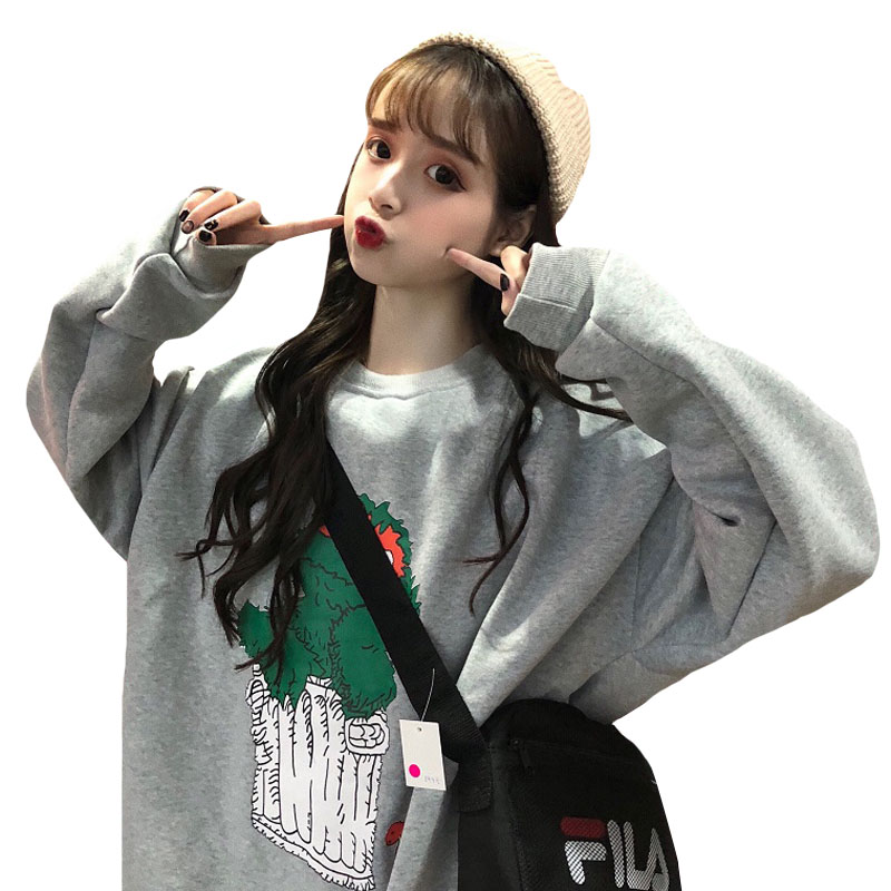 2018新款秋冬女裝韓版中長款寬松慵懶風卡通加絨加厚套頭衛衣外套