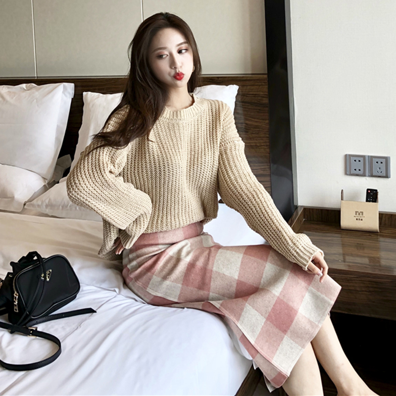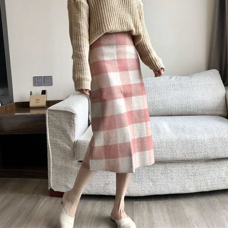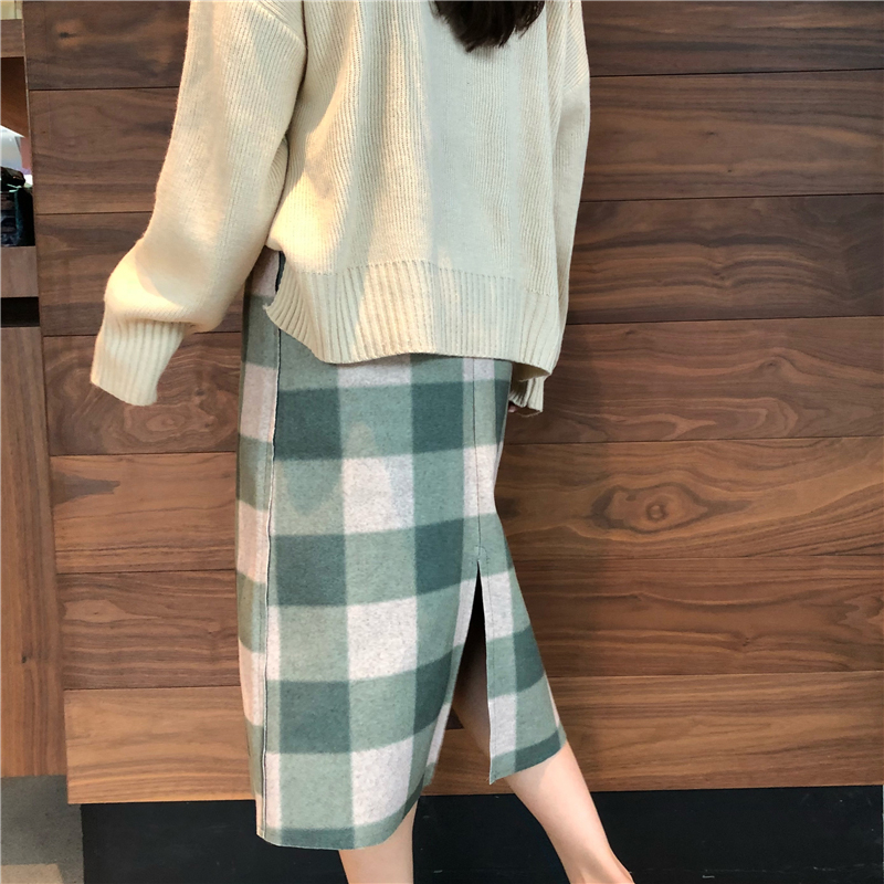 / 港味復古毛呢格子半身裙女秋冬裝2018新款顯瘦氣質開叉高腰包臀裙