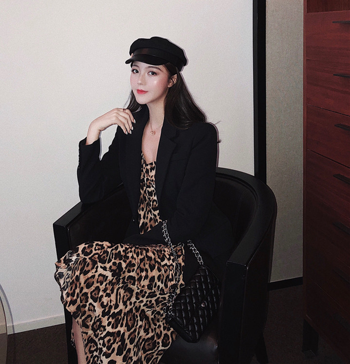 / 2018新款時髦不規則拼接百搭荷葉邊氣質時尚豹紋中長款吊帶連衣裙