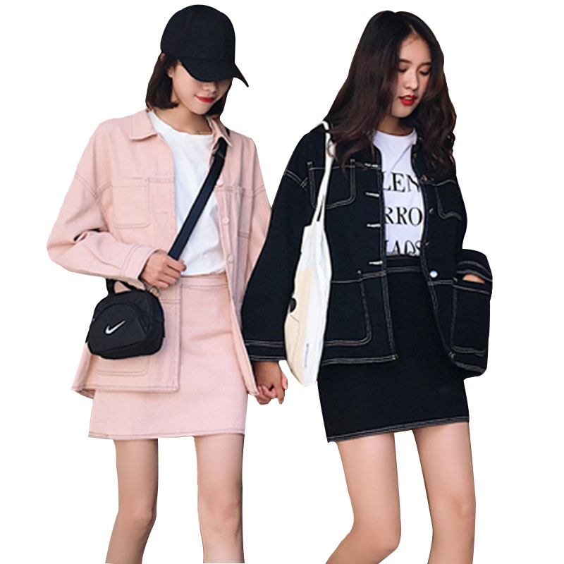 / 韓版時尚休閑套裝秋裝長袖牛仔上衣外套+高腰包臀裙短裙兩件套女