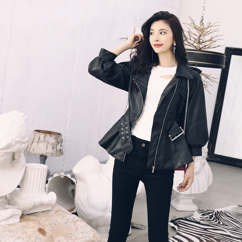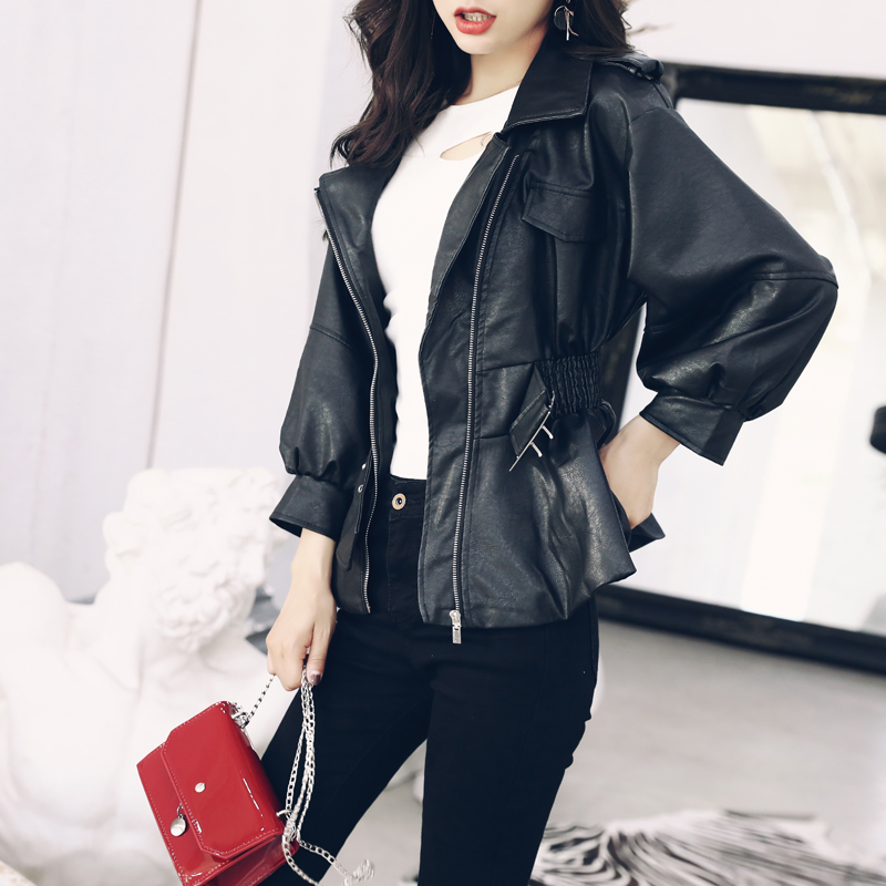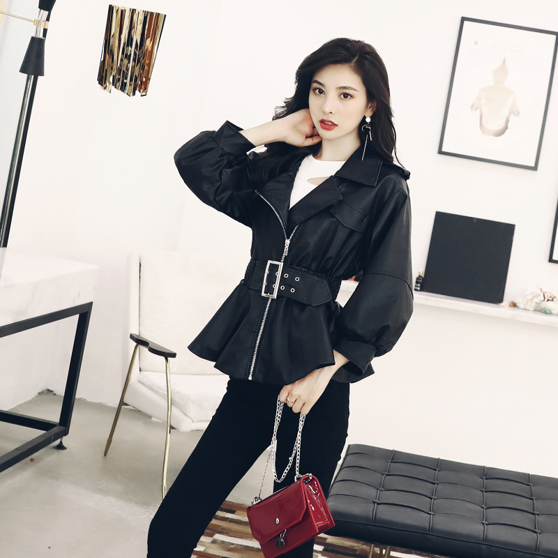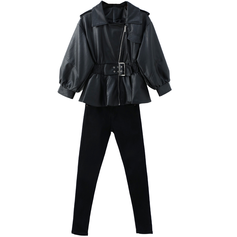 名媛氣質歐洲站2018秋新款皮衣收腰外套夾克牛仔小腳九分褲子套裝