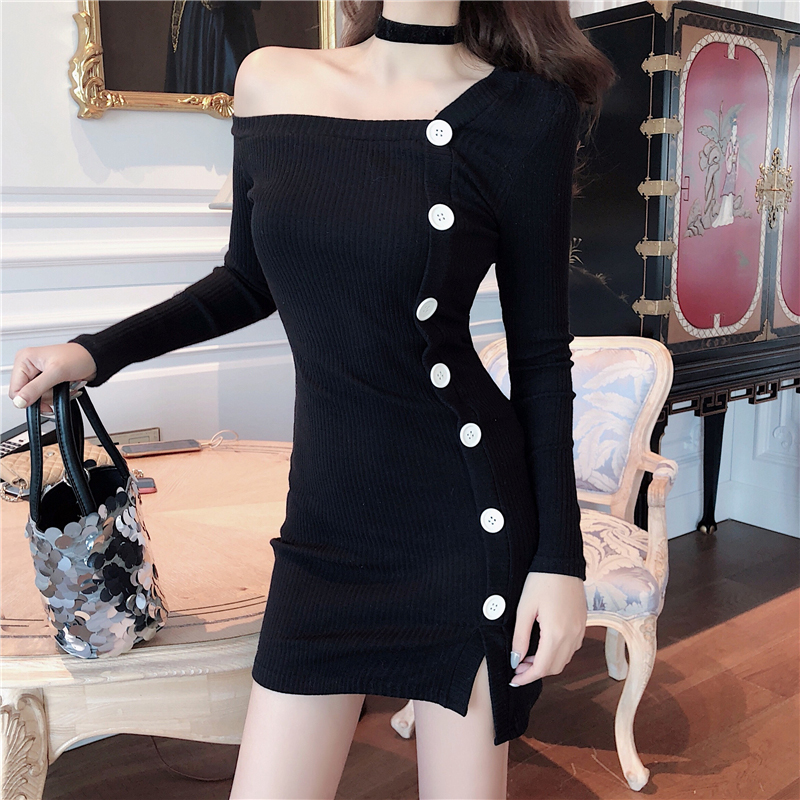 / 露肩長袖修身顯瘦包臀連衣短裙女秋冬裝新款氣質法式黑色桔梗裙子