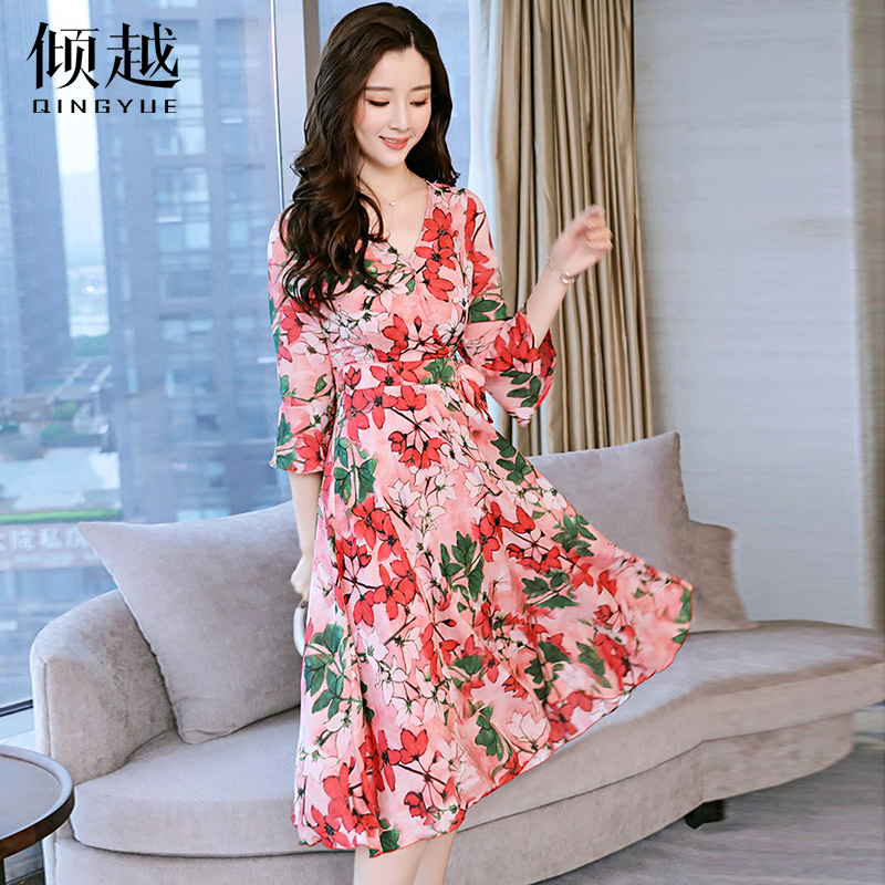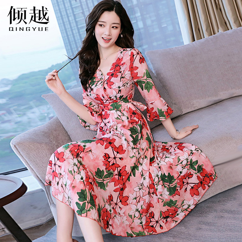 裙子女夏2017中長款連衣裙女大碼女裝碎花雪紡裙韓版顯瘦沙灘裙女
