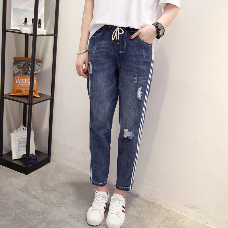 破洞牛仔褲女春夏季新款寬松顯瘦條紋低腰褲子韓版系帶小腳褲