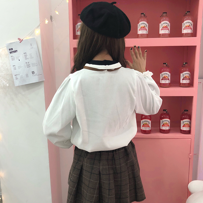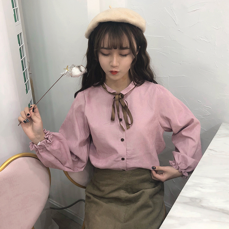 / 冷系女秋裝2018新款韓范學院風清新燈芯絨襯衣蝴蝶結系帶襯衫上衣