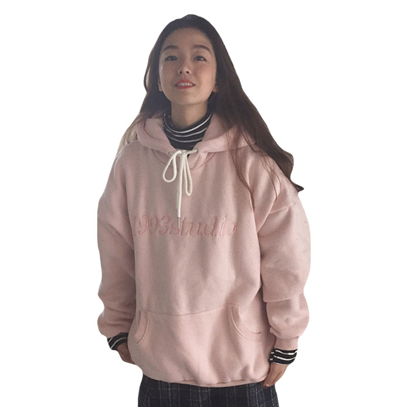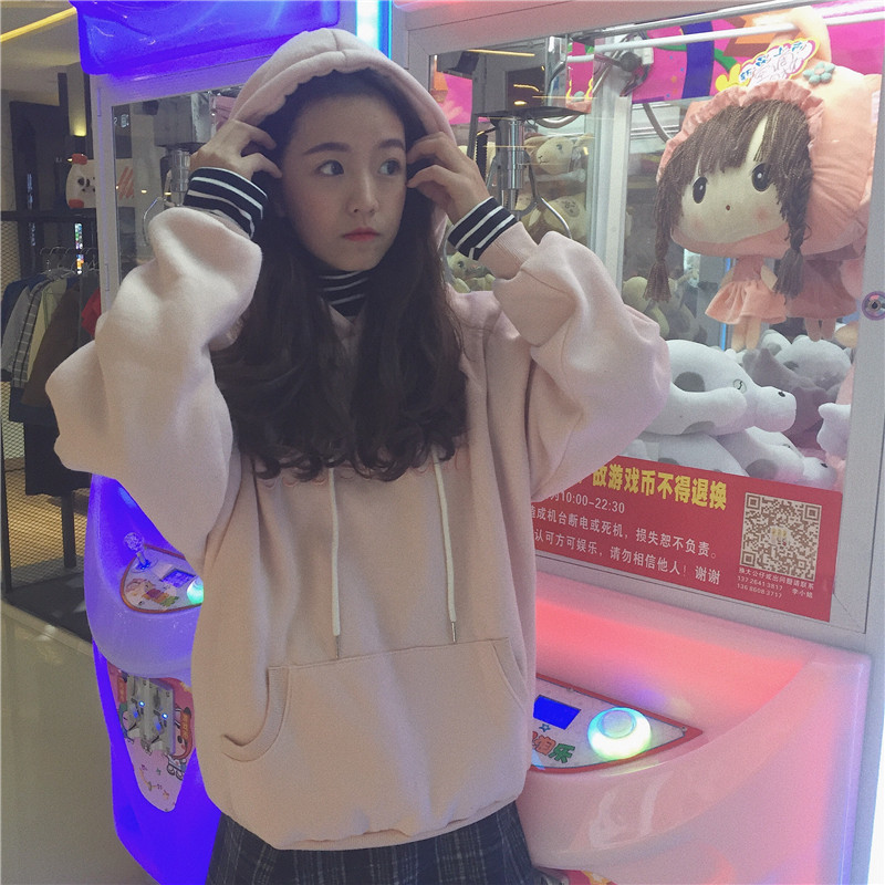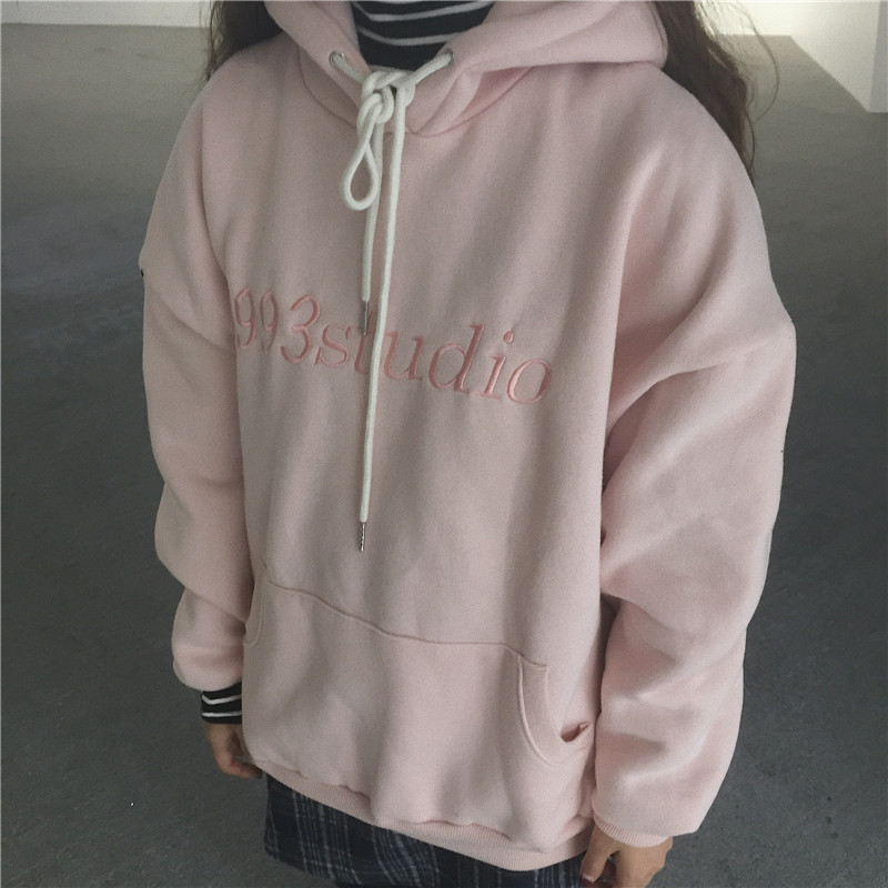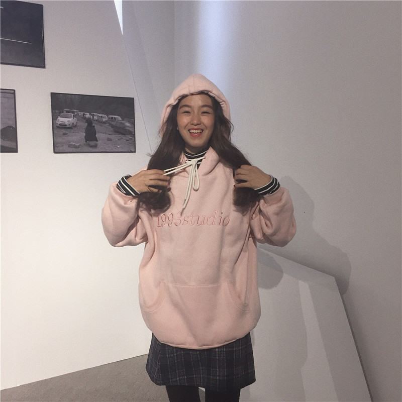秋冬女裝韓版學院風寬松加絨字母刺繡連帽套頭慵懶風超火衛衣外套