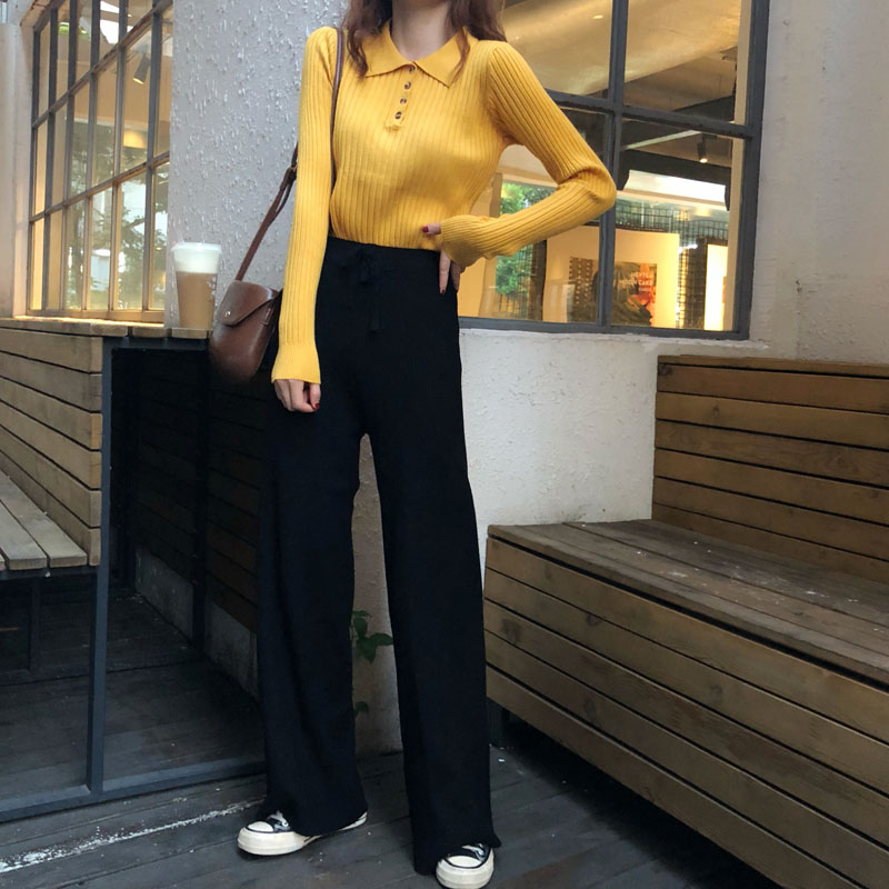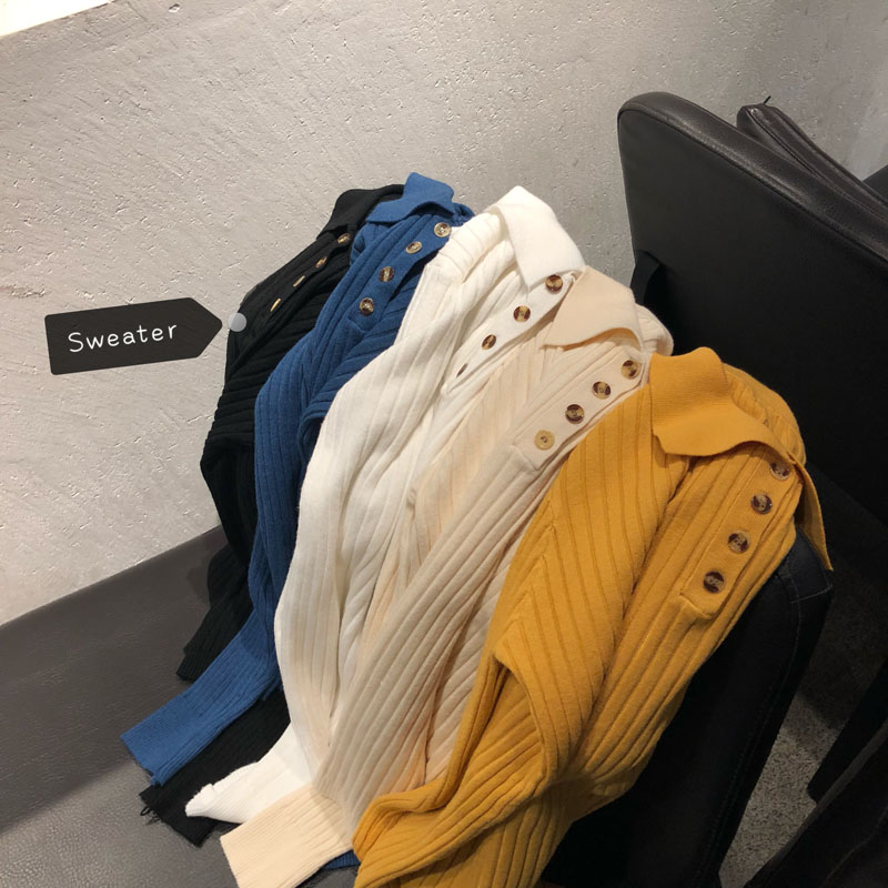 / chic秋季百搭韓國新款打底衫純色氣質時尚復古排扣翻領針織上衣女