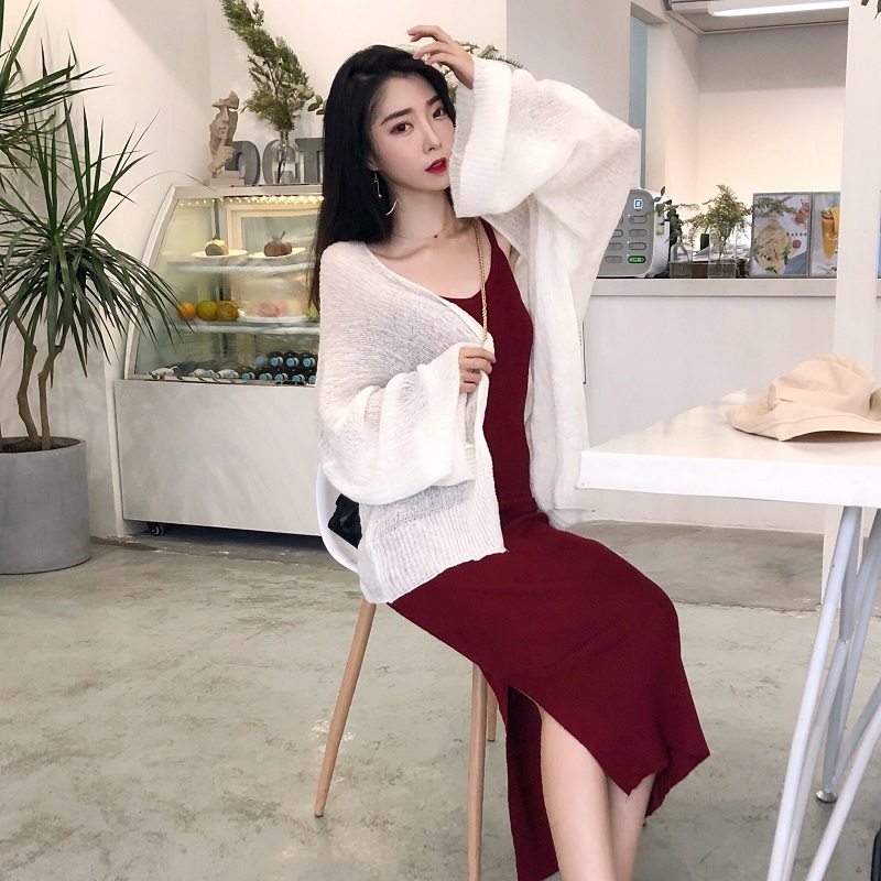 白色開衫|酒紅吊帶裙|黑色吊帶裙|灰色開衫