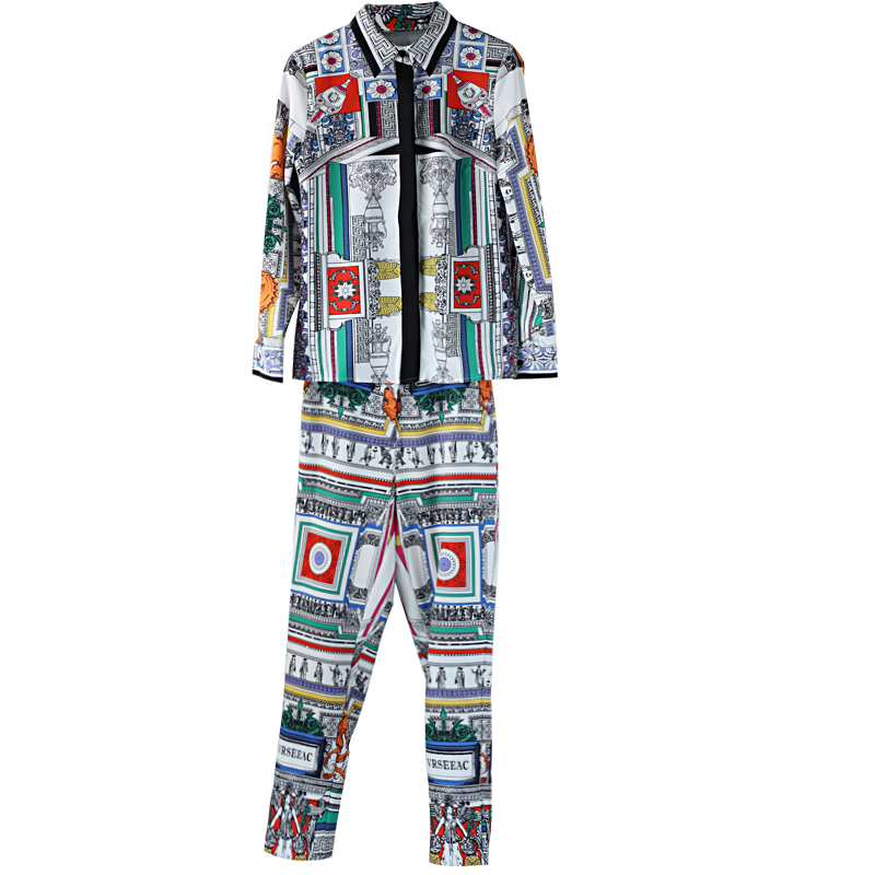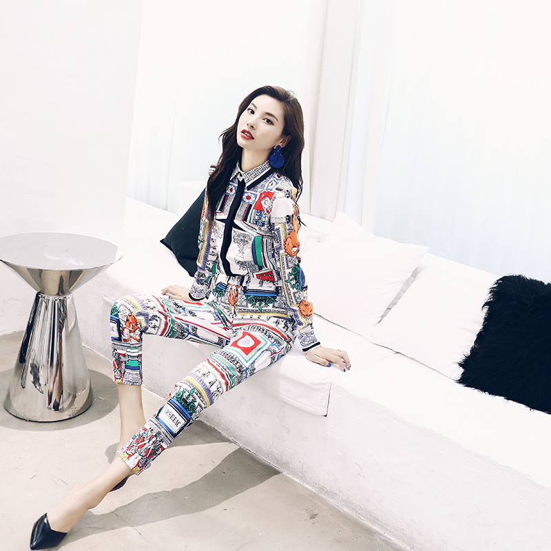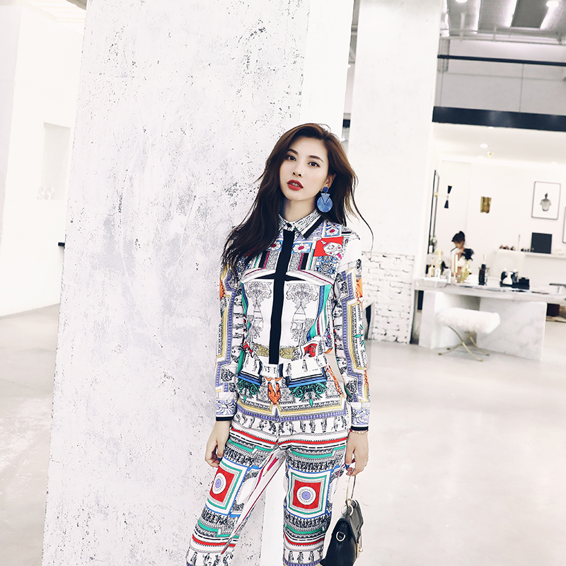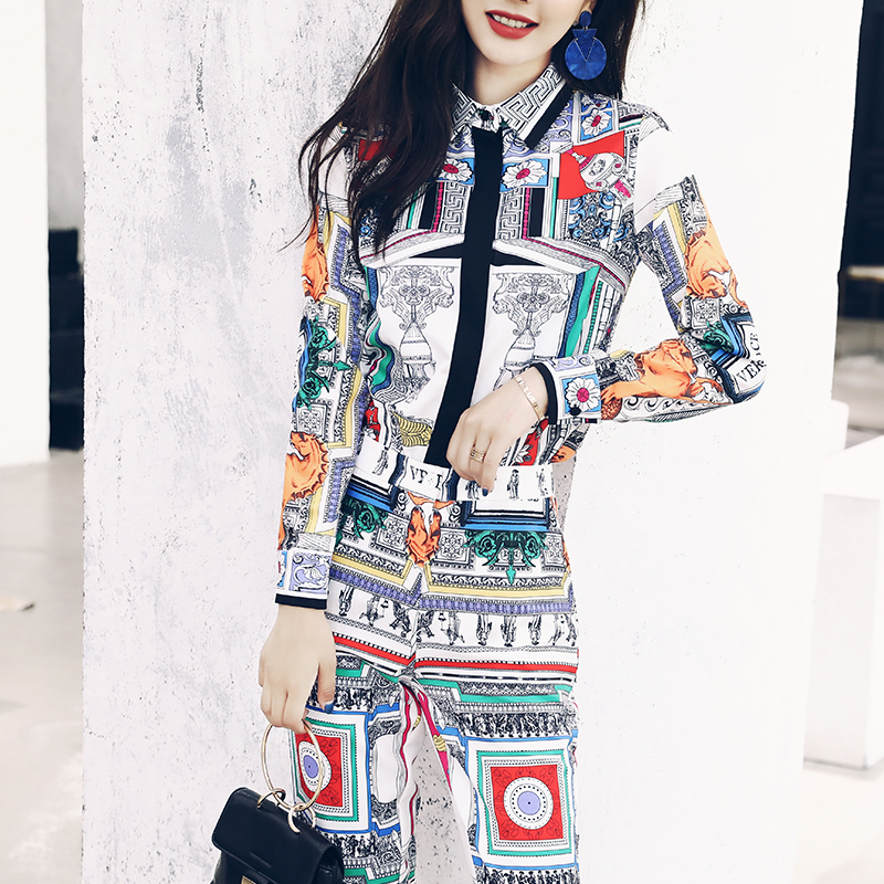 / 名媛氣質2018秋季新款套裝印花襯衫高腰修身九分小腿褲時尚兩件套