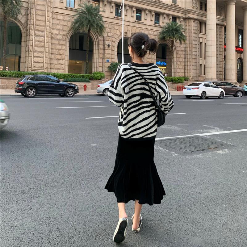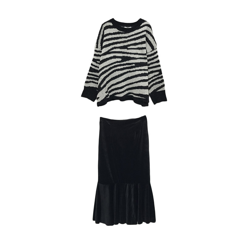 黑白斑馬紋圓領套頭毛衣女秋冬2018新款潮+金絲絨顯瘦魚尾裙套裝
