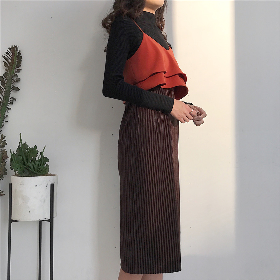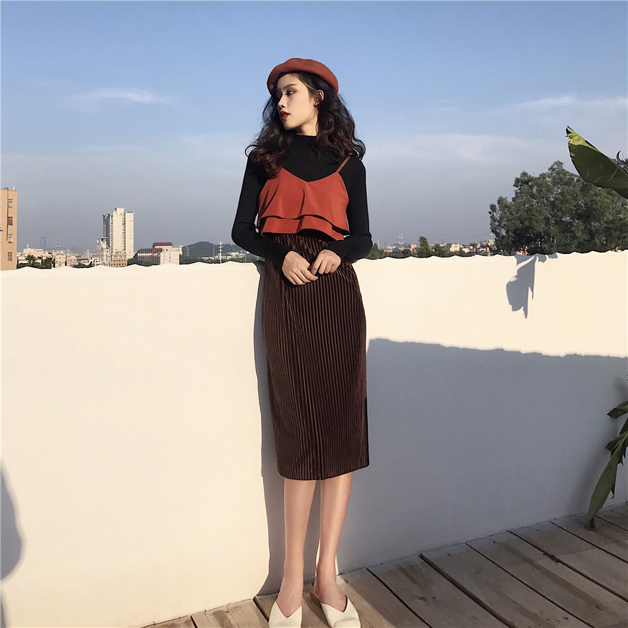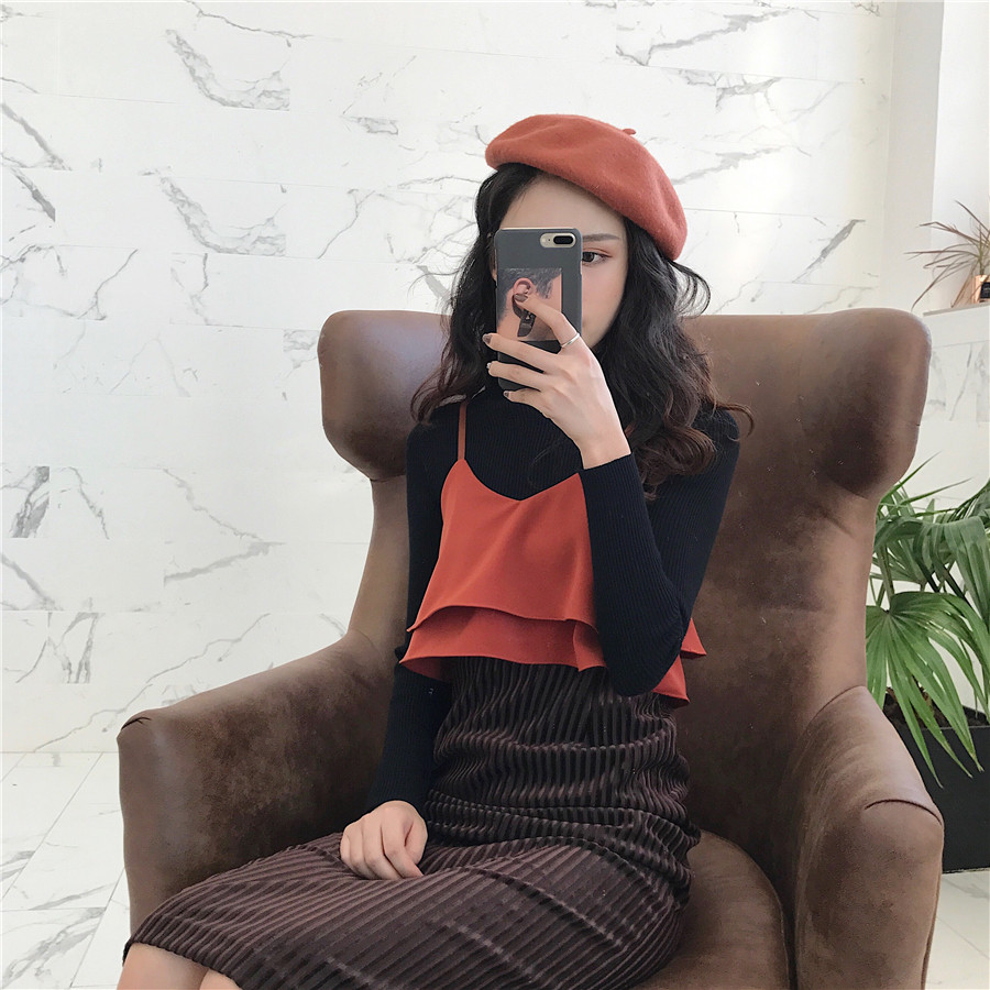 荷葉邊復古絲絨吊帶連衣裙+黑色針織套頭顯瘦半高領打底衫分開拍