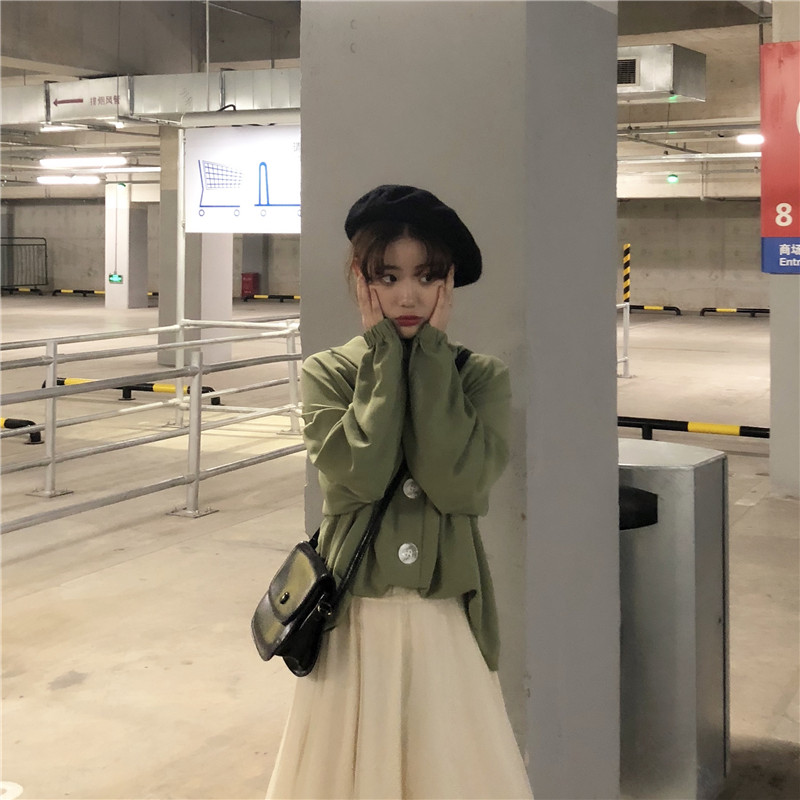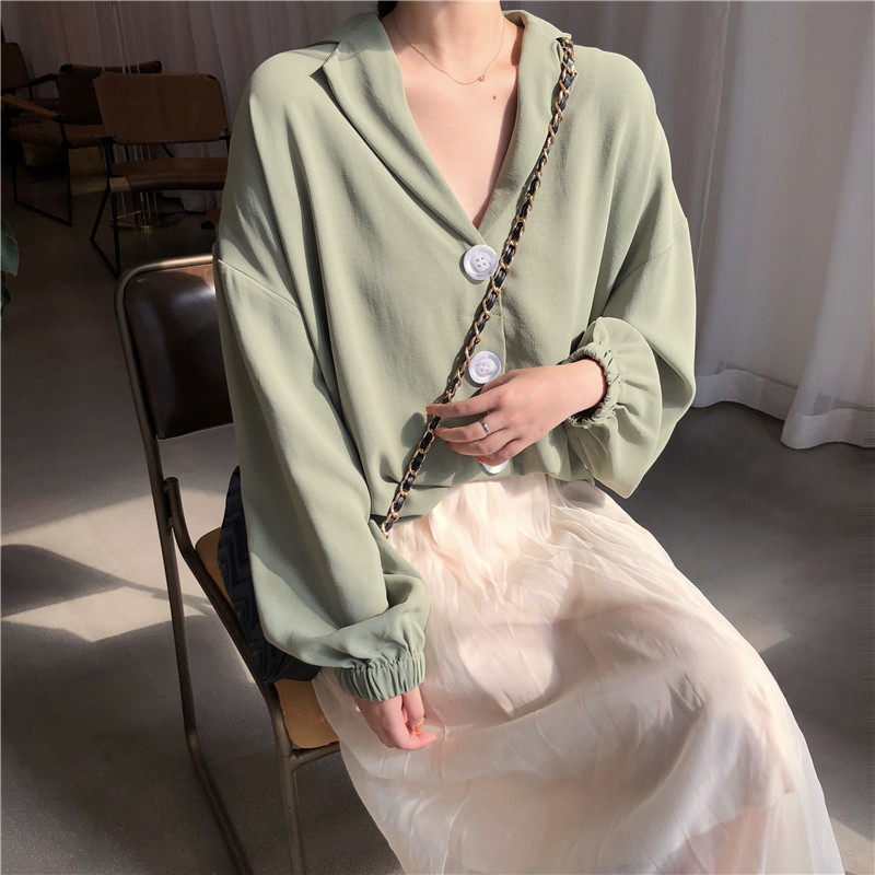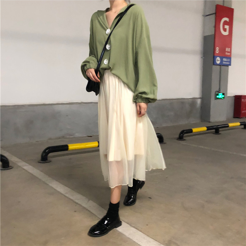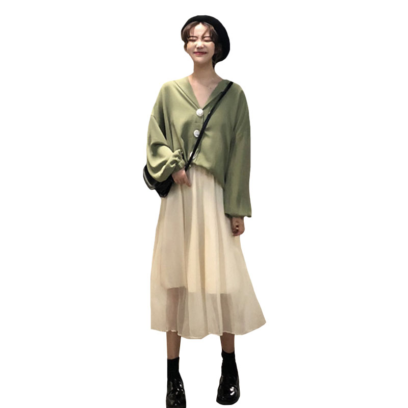 / 韓版時尚休閑套裝秋季寬松純色長袖襯衫+網紗半身裙長裙兩件套女