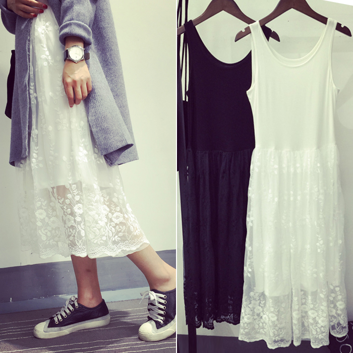 日系小清新的仙女裙~ 這款是無袖小背心裙的哦 妹紙們可以看下平鋪圖了解下細節的 裙子是棉的小背心拼接蕾絲的中長裙子的呦 上身的小背心綿柔的柔滑 無敵舒適各種愛的 下邊是及視感的蕾絲鉤花網紗裙 若影若現的 這款單穿都仙美仙美的