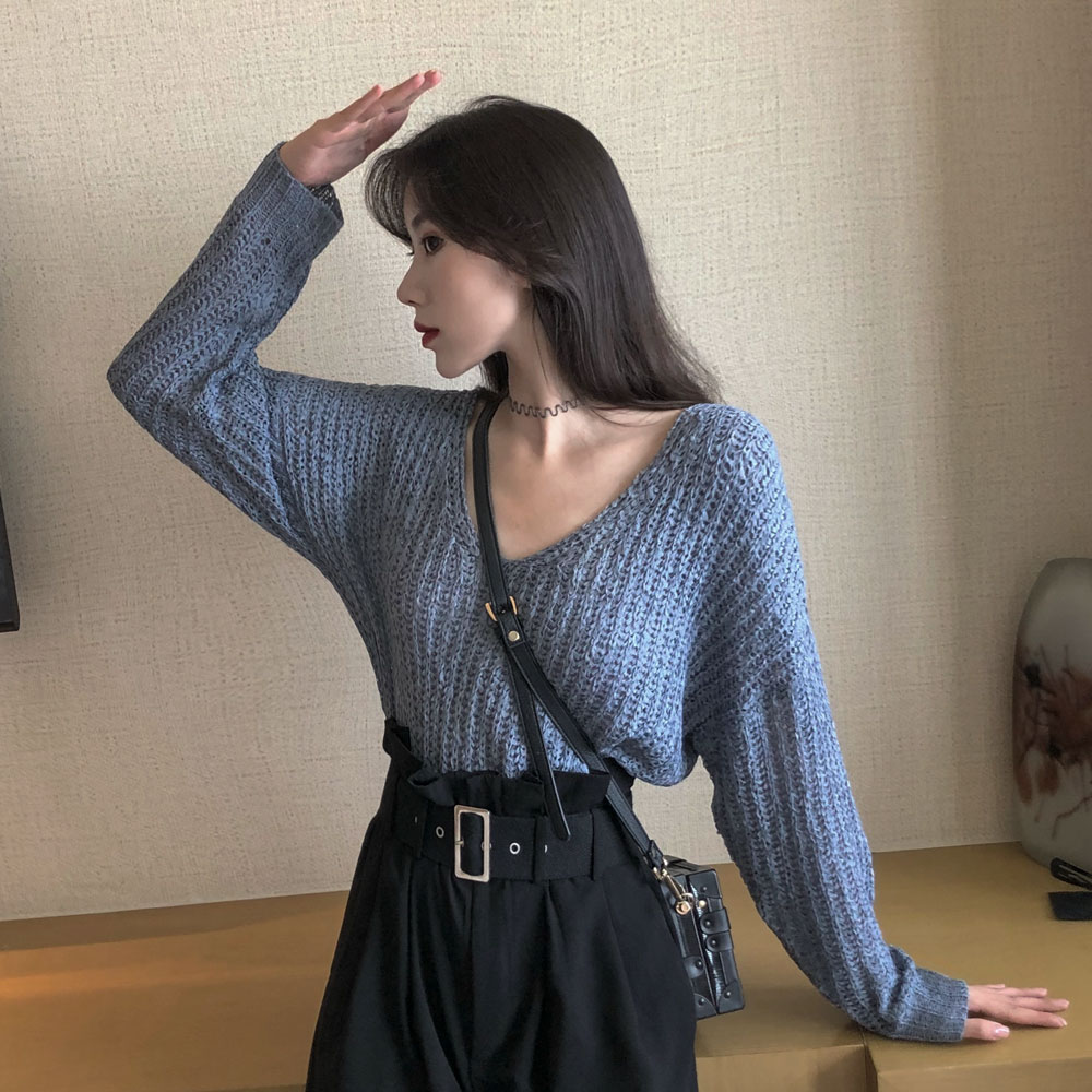 秋上新chic港風復古長袖寬松薄針織衫毛衣女大V領百搭純色上衣潮