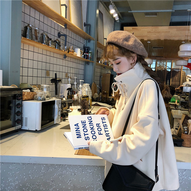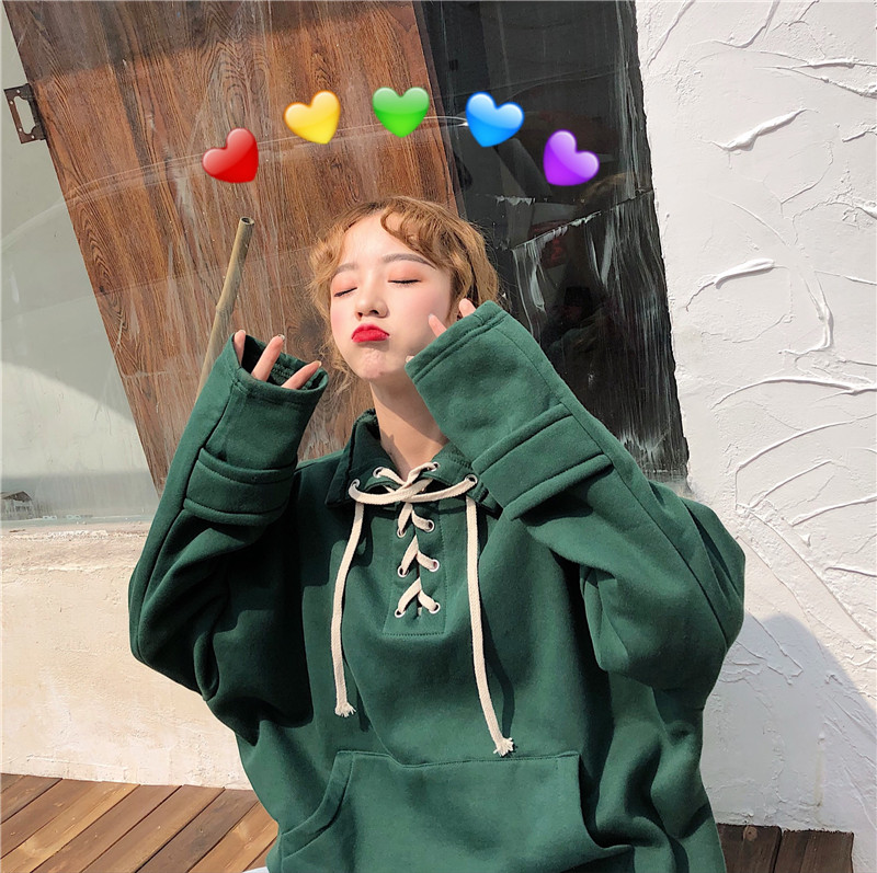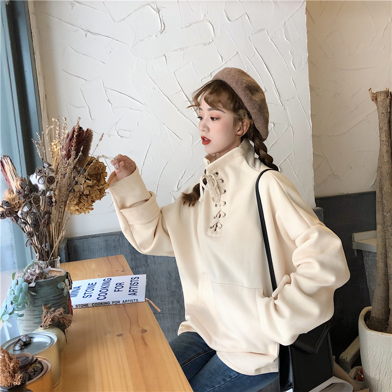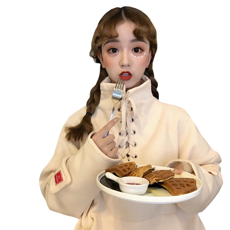 2018新款秋冬女裝韓版寬松綁帶高領加絨加厚套頭超火衛衣上衣外套