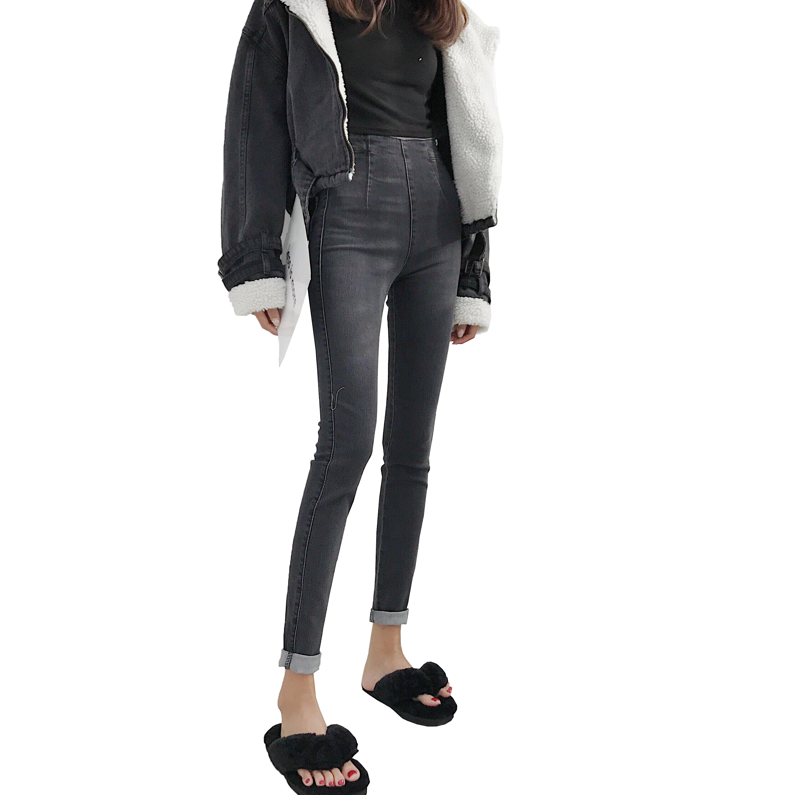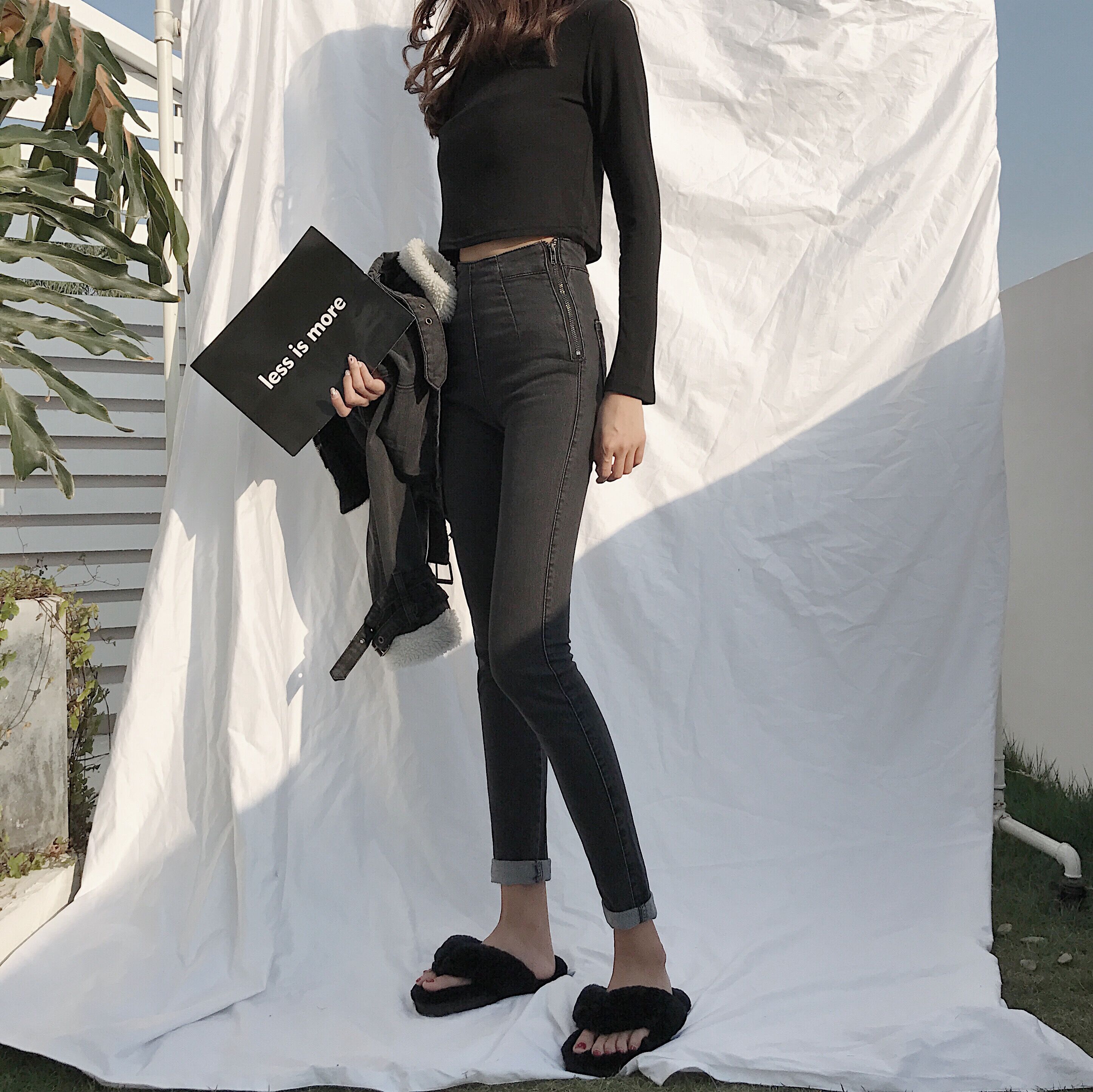 / 秋季新款復古港味chic高腰修身顯瘦黑灰牛仔褲氣質拉鏈水洗鉛筆褲